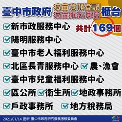 盧秀燕市長表示,為提升登記疫苗施打意願,中市府特地結合多處服務據點(區公所、衛生所、戶政事務所、地方稅務局、地政事務所、北區長青服務中心、部分漁、農會、台中市老人福利服務中心1樓、台中市兒童福利服務中心等)提供諮詢及操作服務。因考量世代差異,彌平使用者數位能力上的落差,長輩或不熟悉預約平台操作者,設有疫苗意願登記服務櫃檯的機關,即有專人可以提供諮詢並協助預約平台操作,歡迎有需求民眾就近前往利用,提醒民眾攜帶健保卡進行預約登記,或由家屬代為預約。市政府提供貼心的服務,與民眾一起並肩作戰對抗病毒。