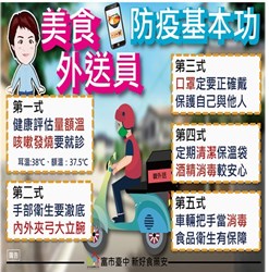 食安處長傅瓊慧呼籲,在疫情期間,外送車輛及保溫箱應加強清潔與消毒,提升食品配送的安全;外送員須做好個人健康自主管理,例如定時量體溫、全程佩戴口罩、勤洗手等;為落實「無接觸送取餐原則」措施,建議平台業者暫停使用現金交易服務、送餐至住家門外或大樓社區管理室、外送員應與消費者保持社交安全距離,降低感染風險。市府為加強防疫措施,保障外送員權益,特別贈送口罩予外送人員職業工會,全力維護外送服務員及市民健康。(7/21*18)*食安處