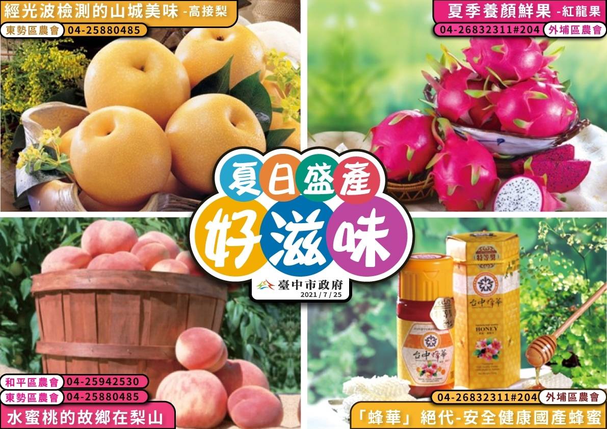 用行動挺農民!國內新冠肺炎疫情衝擊農民生計,台中市政府積極協助農產行銷,除輔導農會引進高科技儀器挑選水準之上的水果,也輔導果農提升品種跟栽培技術,市長盧秀燕今(25)日藉疫情線上記者會,推廣台中當季盛產的水梨、水蜜桃、紅龍果及經評鑑獲獎的「台中蜂華」國產蜂蜜,鼓勵消費者多選購在地生產的優質農產品,一起用實際行動挺農民。