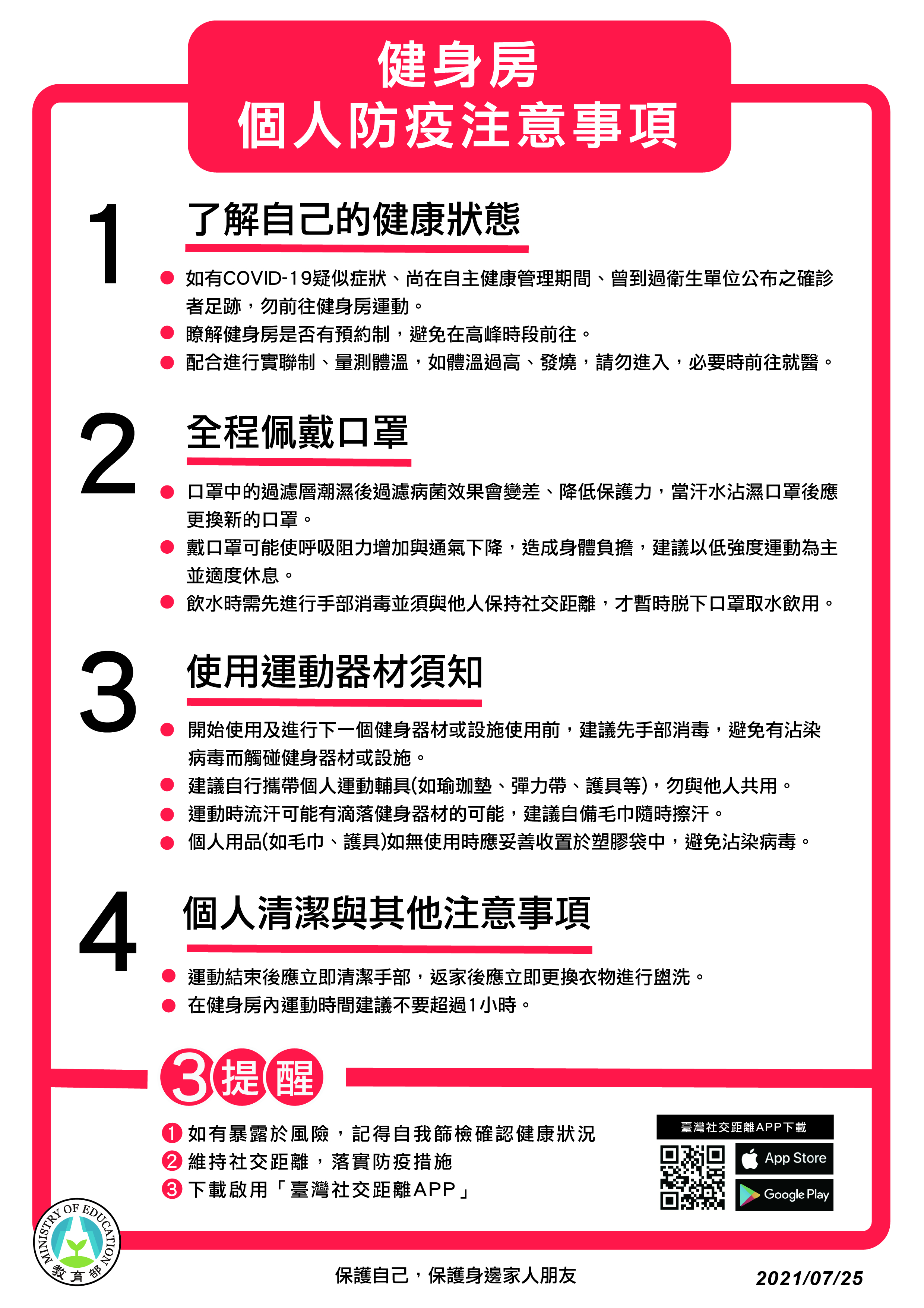 運動局提醒,業者應依體育署「競技及休閒運動場館業因應COVID-19防疫管理指引自我查檢表」自行檢核及填寫,若查獲違反指引,將依傳染病防治法及停止營業相關規定進行裁罰。相關疑問可撥打教育部體育署諮詢專線洽詢:(02)87711515(02)87711843(02)87711847(02)87711881。(7/26*10)*運動局