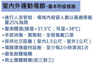 場館業者應遵循防疫管理指引,場域內容留人數以最適承載量50%為限、實聯制、全程佩戴口罩、保持社交距離、個人自備器具或器材不得互相借用,如由場館提供器材或器具,轉換使用者前後應消毒、器材及設備應維持間隔開放使用,並符合1.5公尺社交距離,如無法維持則該區域不開放、加強環境、器材消毒清潔工作,至少每2小時清潔消毒1次、業者應於撞球檯及保齡球道前,提供酒精、拋棄式擦拭布,每球檯及每球道以2人為限、教練未施打疫苗或接種未滿14天者,於第1次授課前,應提供3日內快篩或PCR檢驗陰性證明,且每37天需再定期快篩,業者應造冊紀錄。