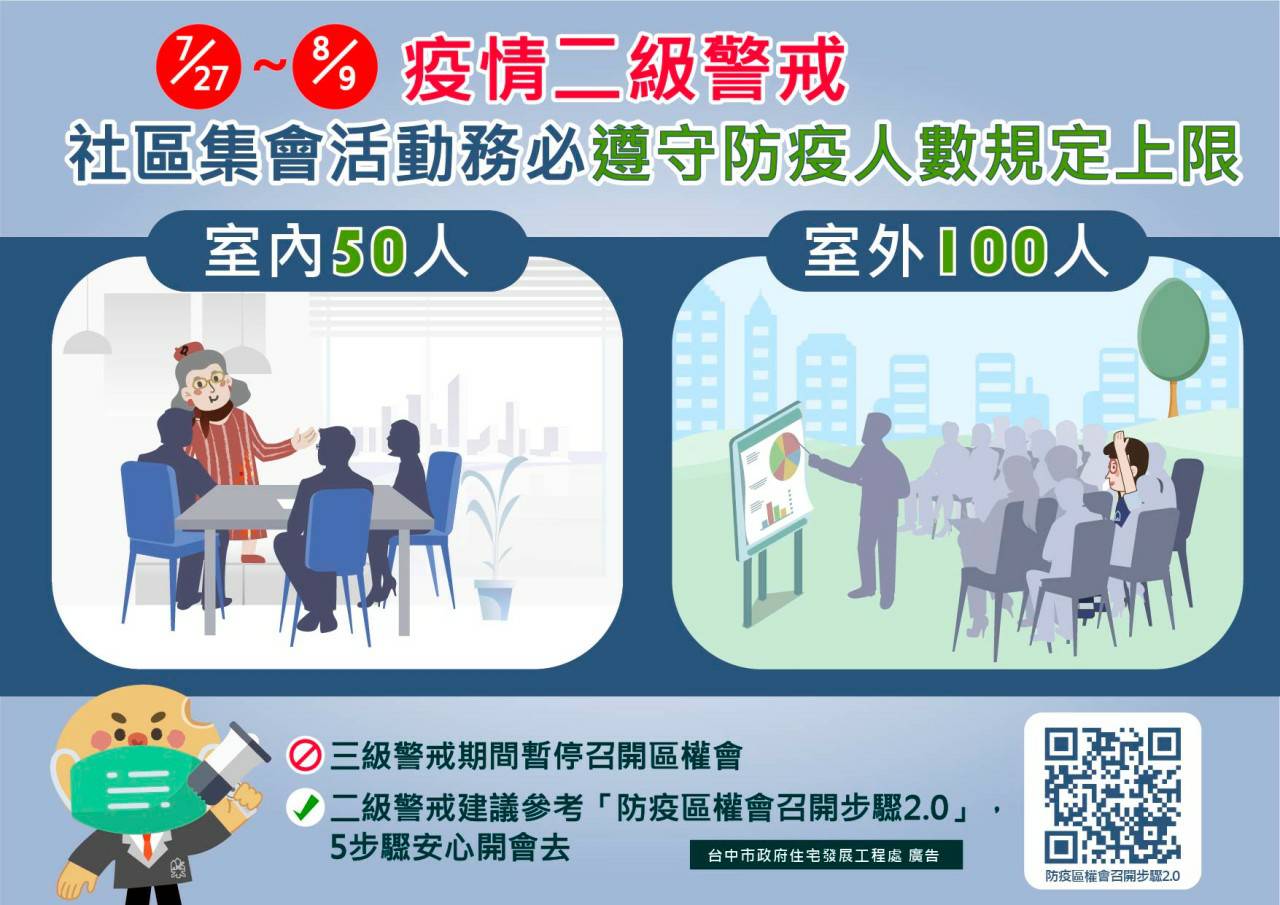 全國疫情警戒自昨(27)日起至8月9日降為二級警戒,因應各社區可能有召開區分所有權人的會議需求,台中市住宅發展工程處透過輕鬆有趣的影片,提供二級以下疫情警戒地區「防疫區權會召開步驟2.0」指引及建議作法,包括社區分流報到、開票計票公開透明、室內外人數上限等措施,也於台中樂居管家LINE官方帳號推播,提醒社區落實防疫不鬆懈。