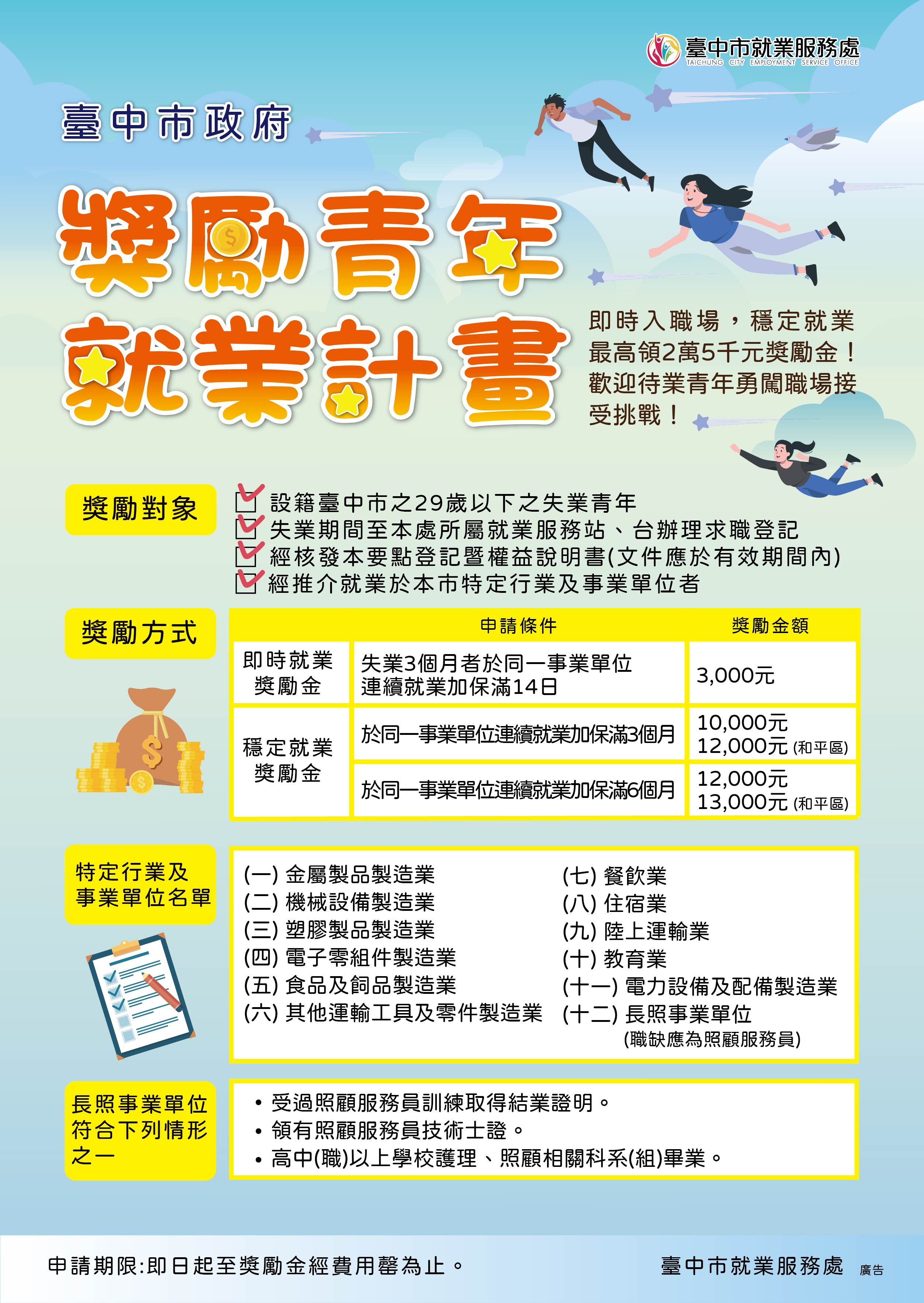 勞工局長張大春表示,市府除全國首創「視訊2.0徵才服務」,青年免出門即可參加徵才面試,並規劃多場實體及視訊雙軌併行的徵才活動,提供多元媒合管道,青年經錄取上工且穩定就業滿3個月、6個月即可分別申請1萬元及1萬2,000元獎勵金,待業逾3個月以上的青年,經推介就業滿14天,還可領取「即時就業獎勵金」3,000元,獎勵金最高共可領取2萬5,000元!