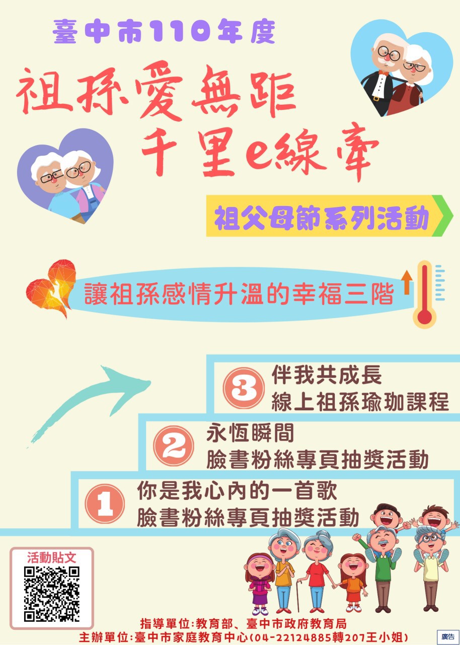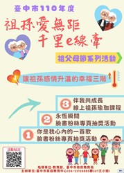 歡慶8月22日祖父母節,今年因應疫情,台中市政府教育局與台中市家庭教育中心規劃「祖孫愛無距 千里e線牽」祖父母節線上系列活動,自8月10日起至28日,展開三階段線上慶祝活動,包括錄製獻給祖父母的歌、祖孫合照上傳臉書、線上參加祖孫瑜珈課程,參加活動可獲限量小禮物,歡迎民眾踴躍運用網路向祖父母告白。