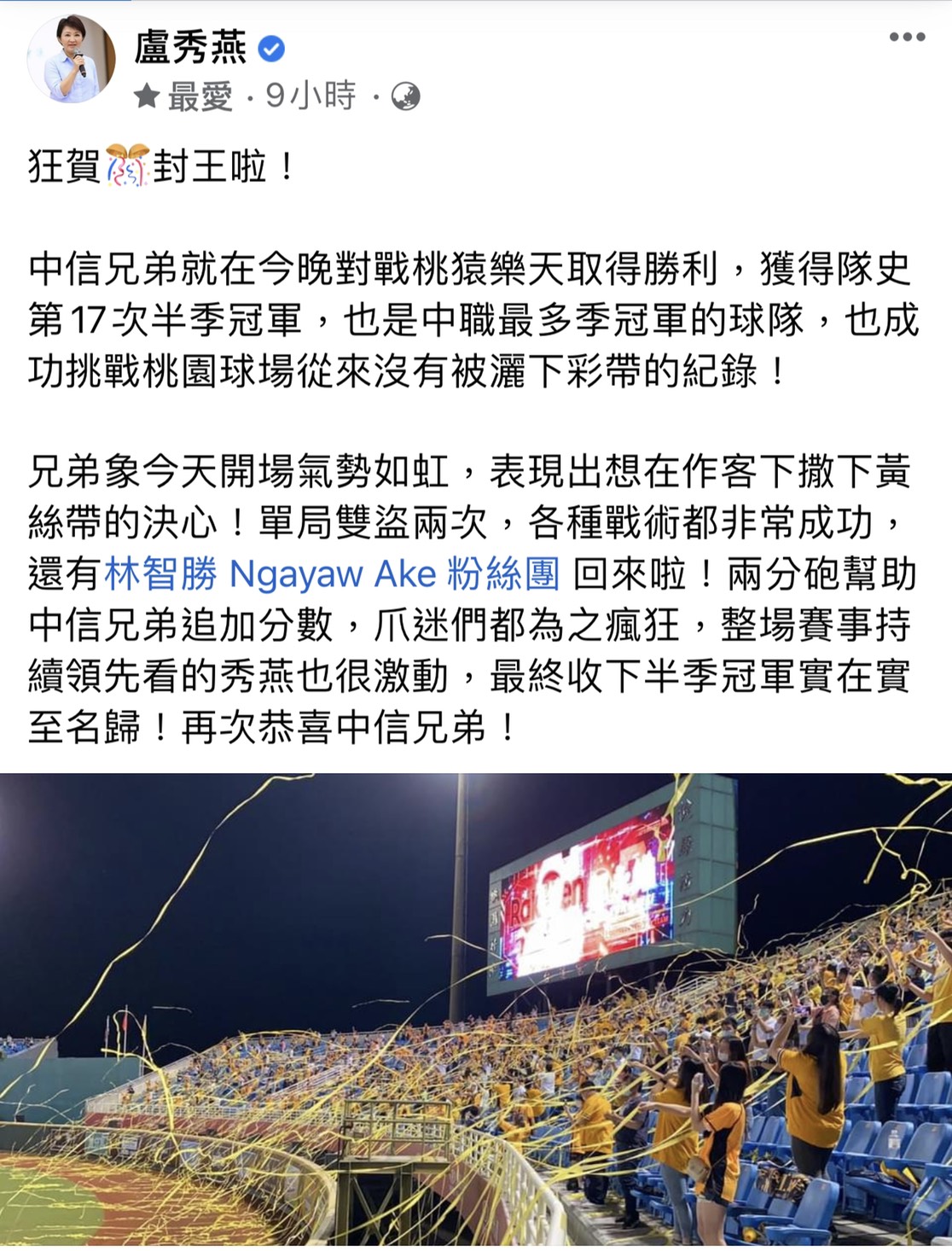 盧市長於臉書第一時間發文恭賀勇奪上半季冠軍