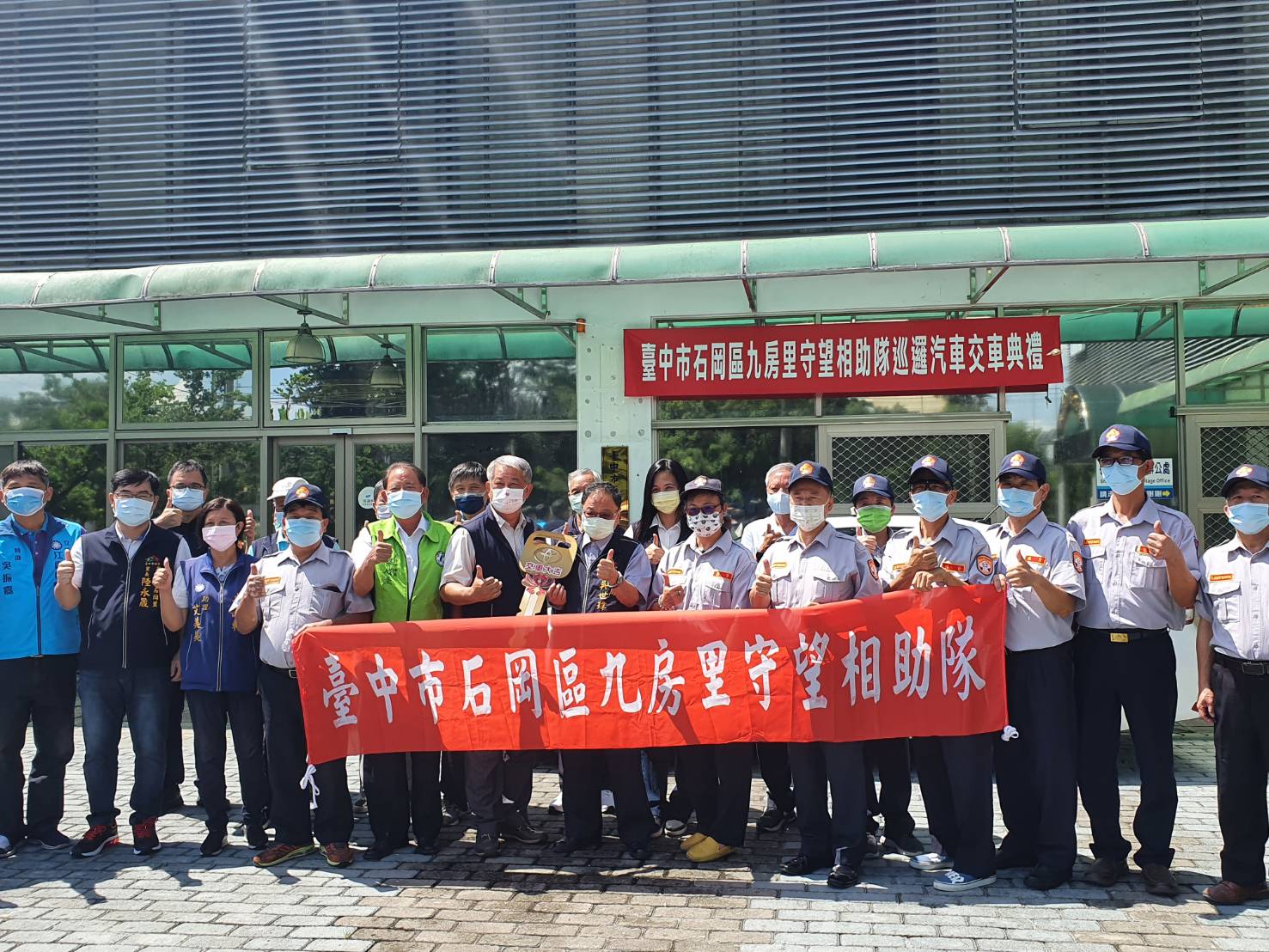 台中市政府為提升山城社區巡邏的安全與機動性,補助石岡區九房里守望相助隊新購巡邏汽車1輛,今(20)日於石岡區公所廣場前舉行交車典禮。民政局長吳世瑋代表市長盧秀燕主持交車儀式,感謝里隊長期為鄰里服務,期盼全新巡邏車強化守望相助隊員執勤安全性,提升社區巡守機動性,加強守護民眾生命財產安全。