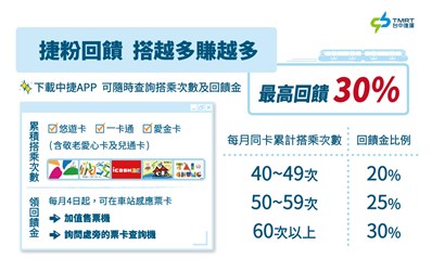 中捷公司指出,配合捷粉回饋專案推出,9月1日起台中捷運app也全新改版,旅客下載中捷app並綁定使用的電子票證卡號,就可隨時查詢搭乘次數及可回饋金額。除現金回饋、搭越多回饋越多之外,中捷公司還會陸續推出更多捷粉好康,詳細內容可參見臺中捷運官網(https://www.tmrt.com.tw/)、台中捷運APP,並加入FB台中捷運粉好康社團,隨時掌握好康情報。