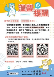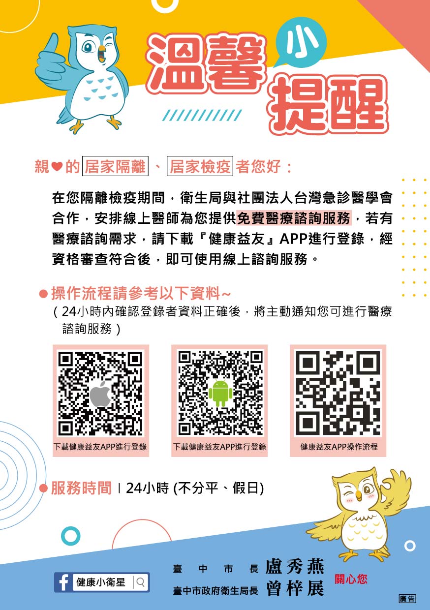 此外,衛生局也特別製作溫馨提醒卡放入居家隔離、檢疫民眾的關護包中,宣導民眾自行下載健康益友APP,遇有身體不適時即可透過APP與線上急診醫師進行醫療諮詢,由急診醫師就民眾狀況提供就醫或繼續居家觀察等建議。