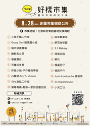 8月28日第7場市集由修平科技大學、亞洲大學、逢甲大學及13組創業青年團隊共同設攤,其中逢甲大學田同學主要展售無毒友善耕作、自產自銷的台灣咖啡、放山雞蛋、洛神花茶等,所有農作物都是從爸爸為維護家人健康,開始耕作自家的田園,用心推廣健康又好吃的食材。