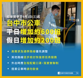 自新冠肺炎全國疫情降為二級警戒以來,台中市公車運量逐步回升,目前已回到疫情前近四成運量,因應高中職以下學校即將在9月1日開學,學生及民眾搭乘公車的需求增加,交通局協調客運業者調整市區公車班次,平日增加約600班,假日增加約200班,供民眾通勤通學使用。