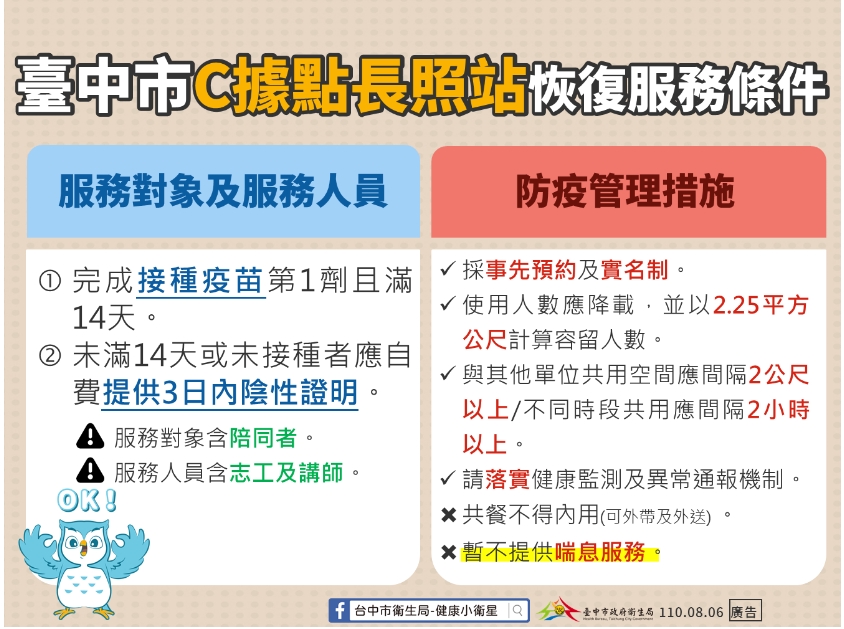 此外,台中市C據點長照站自86日起,也陸續輔導全市103家據點有條件恢復服務。除參加據點活動的長輩及工作人員須依規完成第一劑疫苗接種且滿14日或自費篩檢外,對於活動空間規劃,使用人數應降載,以每人2.25平方公尺計算容留人數,且暫不提供喘息服務,餐飲不開放內用,改採餐盒外帶或外送服務。