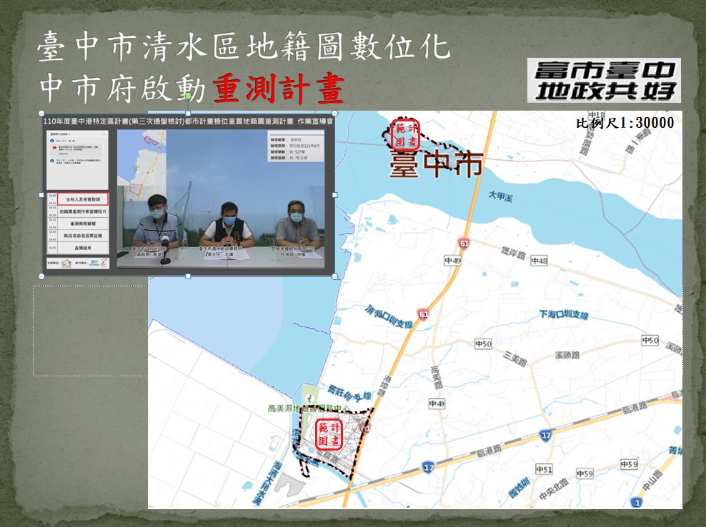 地政局說明,受疫情影響,市府改由線上直播進行地籍圖重測宣導說明會,說明地籍圖重測緣由與法源依據,使重測區內土地所有權人了解地籍圖重測相關程序及規定,並開放民眾上網票選重測後新段名,說明會影音資料已置於網路(龍井區:http://youtu.be/02_1CRY4JKI、清水區:   https://youtu.be/AwQbWi4zFSQ),歡迎民眾觀看。