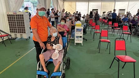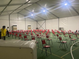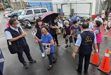 吳局長今日前往龍井「快打站2.0」視察,關心現場長者接種狀況。他表示,龍井區快打站2.0設置於公所對面籃球場,原先搭設鋁合金棚架,並設置20台水冷扇,由於昨日天氣高溫炎熱,仍無法有效降溫阻隔熱氣進入。公所於昨日接種場次結束後,積極調整優化,於鋁合金棚架周圍增設遮陽帆布隔絕熱氣,同時再布設4台10噸冷氣機降低接種環境溫度,讓快打站整體環境舒適。