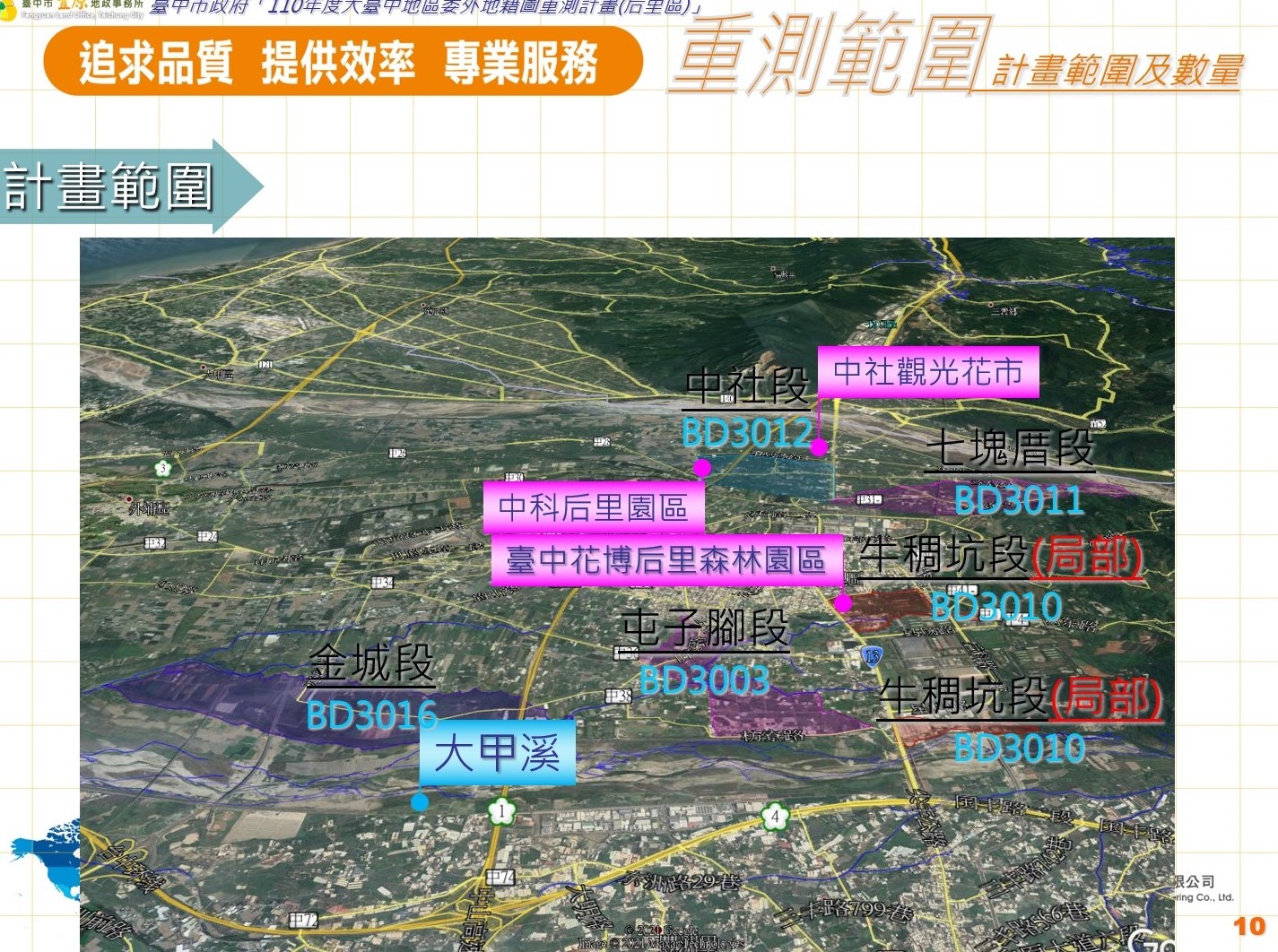 台中市豐原地政事務所辦理「110年度大台中地區委外地籍圖重測」業務,辦理區域為后里區「中社段」、「七塊厝段」、「金城段」、「屯子腳段」及部分「牛稠坑段」,土地筆數約6,050筆,面積約755公頃。為解答民眾疑惑,豐原地所將於9月24及25日分別在后里區泰安里泰安社區活動中心(台中市后里區福興路67-1號)、及后里區舊社社區發展協會(台中市后里區舊社路93號) ,指派專人駐點提供地籍圖重測諮詢服務,歡迎民眾多加利用。