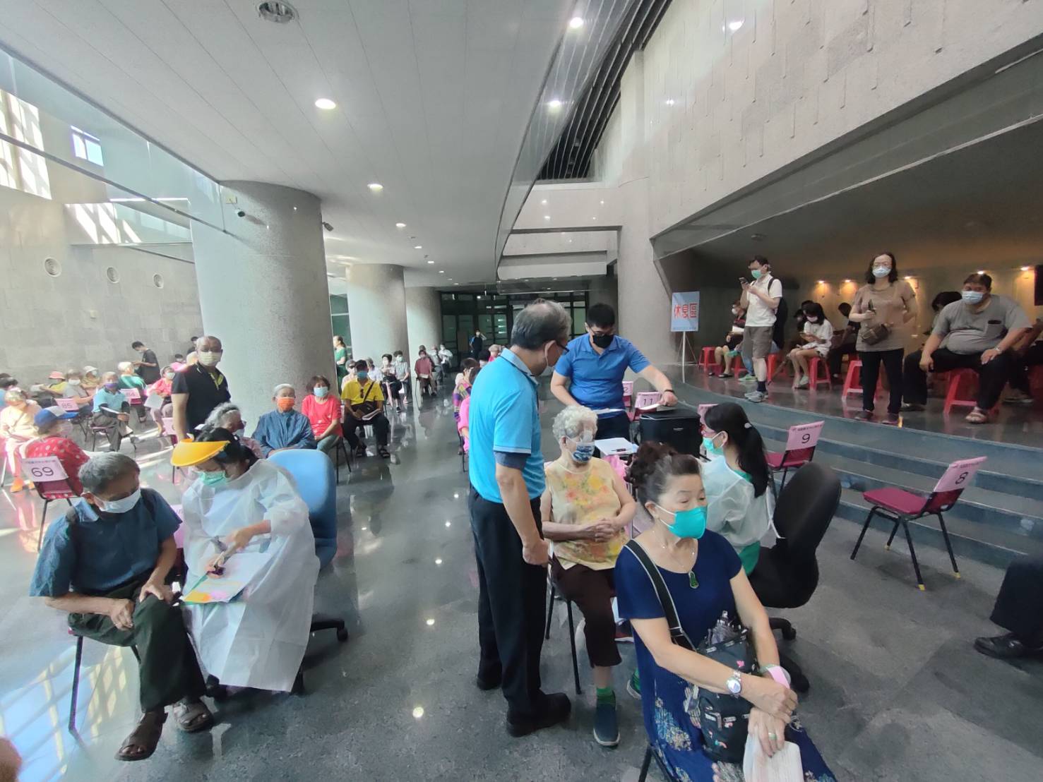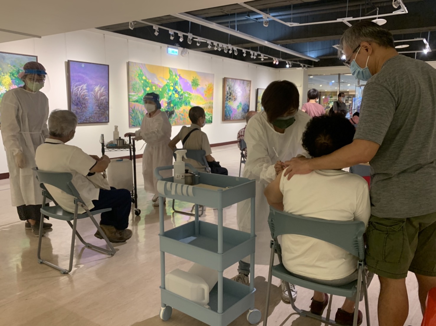 吳局長指出,台中市西區是匯集歷史、文化、宗教、產業的重要地點,轄內學校、文化設施眾多,有著「台中市文教區」的美稱,西區公所為提供市民大空間、動線好、有空調的接種場所,便向「大墩文化中心」洽借1樓藝文走廊第5、6、7展區,在不影響文化中心日常營運下,提供民眾舒適的接種環境,讓民眾接種疫苗兼賞藝文展覽;此外,位於太平區的「屯區藝文中心」也出借1樓演藝廳,協助太平區公所疫苗接種服務,讓民眾接種疫苗後,享受藝文美學的愜意空間。