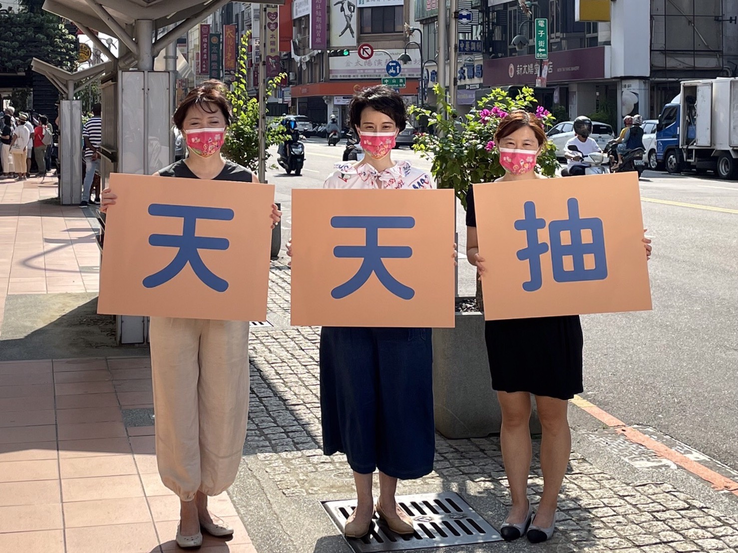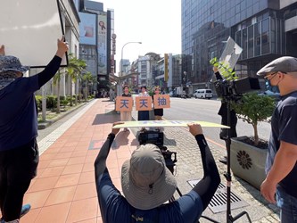 自由路商圈糕餅業者新太陽堂餅店主委王允伶、陳允寶泉副主委翁羿琦及太陽堂老店協理張秋琴三位「自由女神」為台中購物節一同拍攝電視廣告