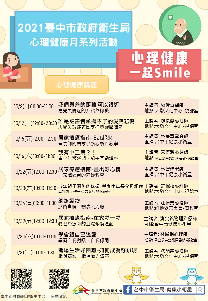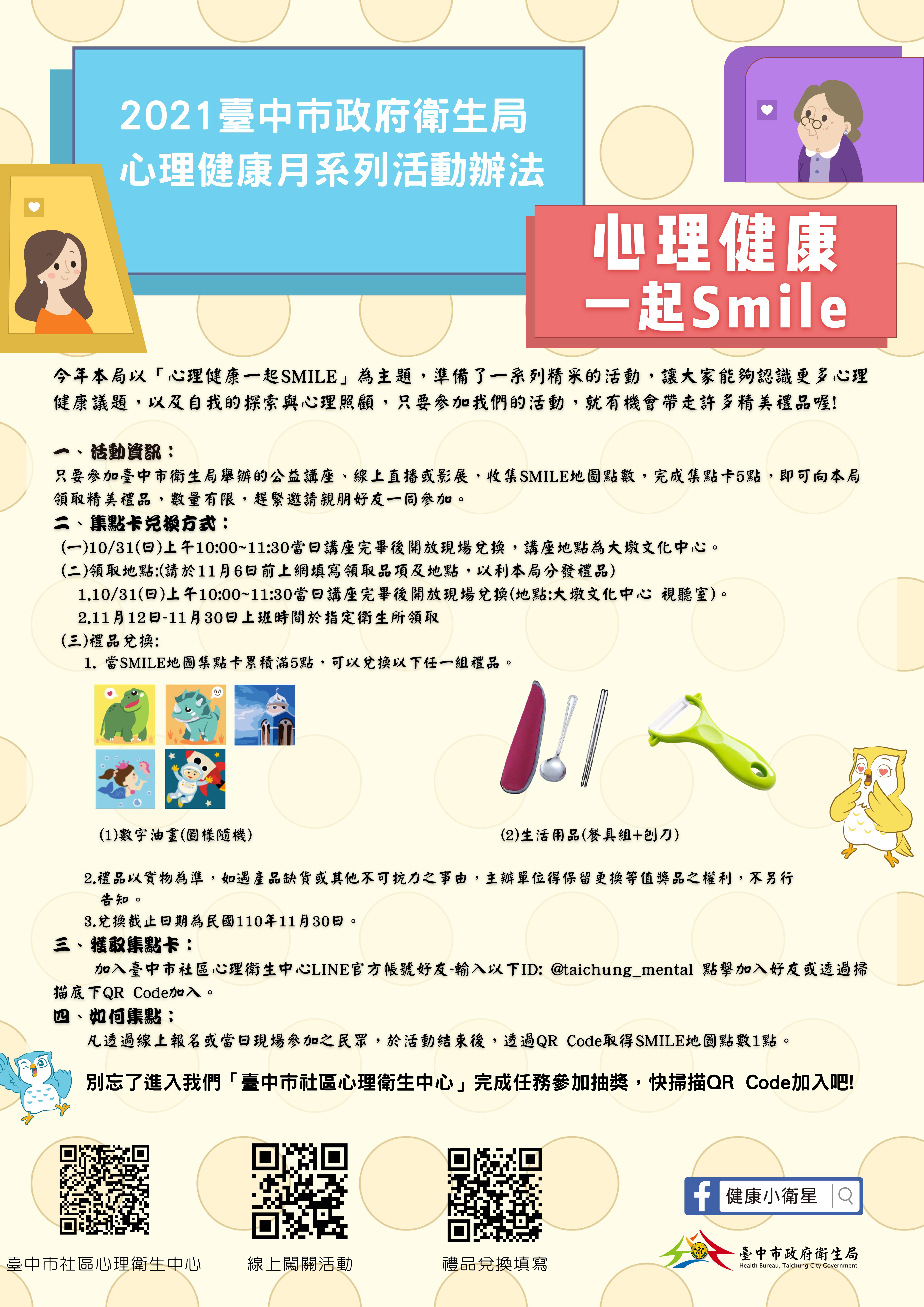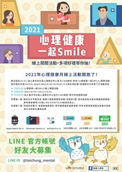 10月10日是世界心理健康日,為因應民眾受到新冠肺炎疫情影響,恐產生的心理健康問題,台中市政府衛生局10月以「心理健康一起SMILE」為主題,於國立公共資訊圖書館、大墩文化中心、維他露基金會舉辦10場不同主題心理健康講座及4場影展,內容多元,包括探索成年親子關係修復、網路霸凌、職場生活等層面的心理議題,歡迎民眾踴躍報名參加。