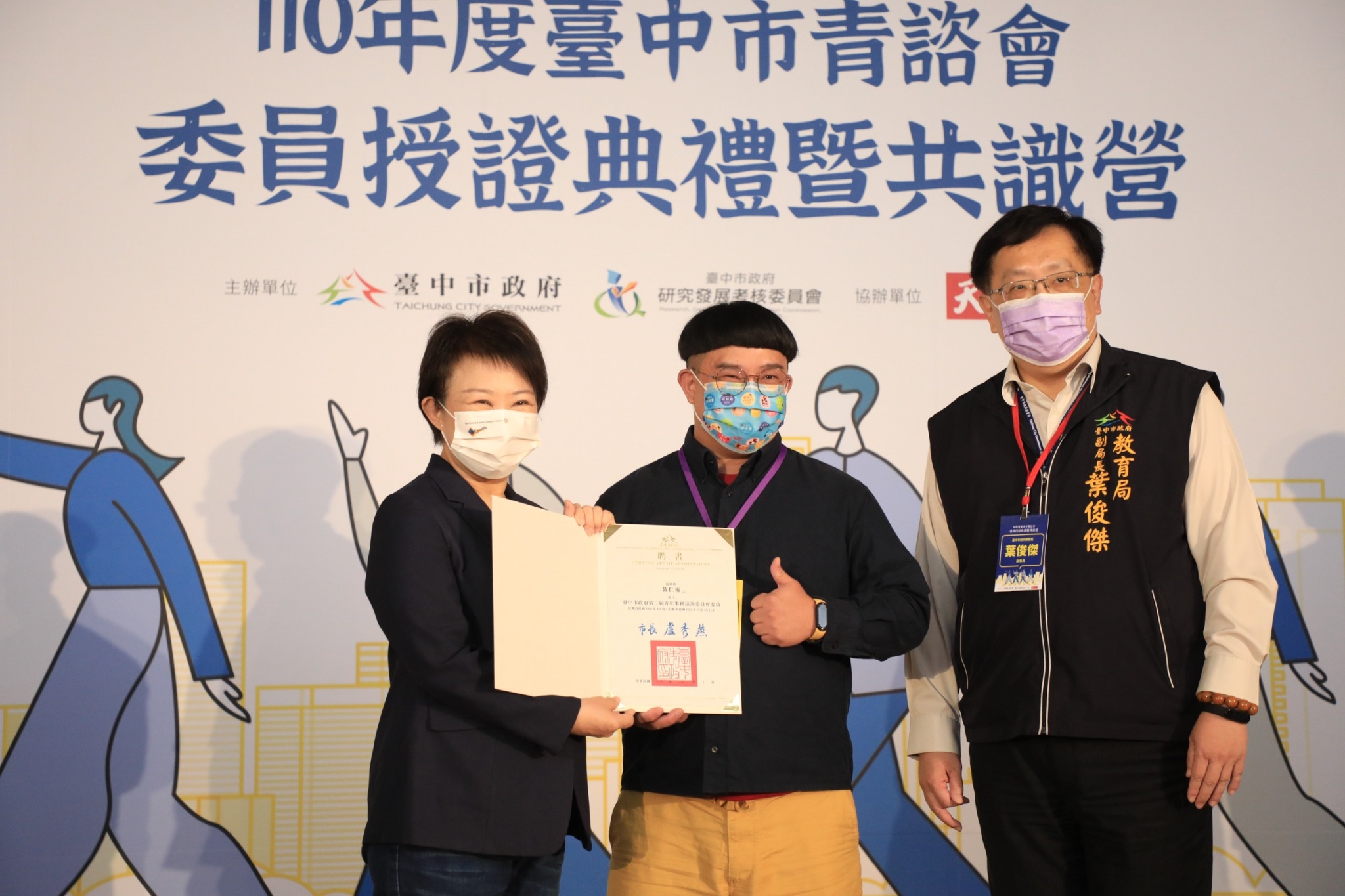 盧市長表示,今日舉辦第二屆青諮會成立與授證,第二屆青諮會自6月疫情嚴重期間進行遴選,原先擔心疫情影響青年意願與熱情,沒想到有335位青年報名突破紀錄,最終產生100位青諮委員,市府對平台極為重視,她今日親自授證,相信第二屆青諮委員會透過大家互相結合展現實力,對於台中市政推動會更加順利。