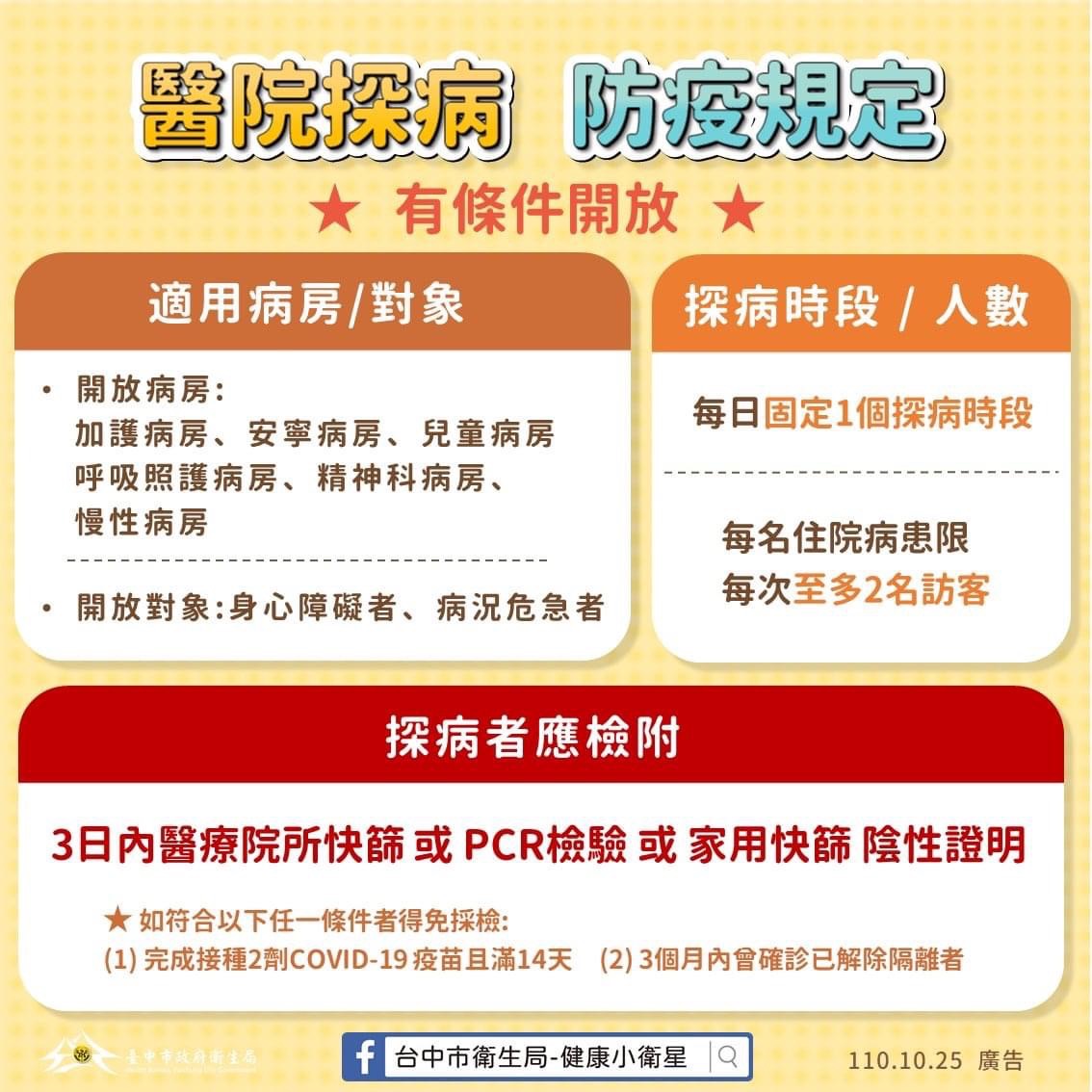 衛生局表示,台中市於10月27日修正「台中市因應COVID-19疫情醫院陪探病管理措施」公告,除原已開放加護、安寧、呼吸照護、精神科、兒童病房及身心障礙者、病況危急者接受探病,今起增加慢性病房開放探病,並增修家用快篩檢驗結果作為認列探病依據。