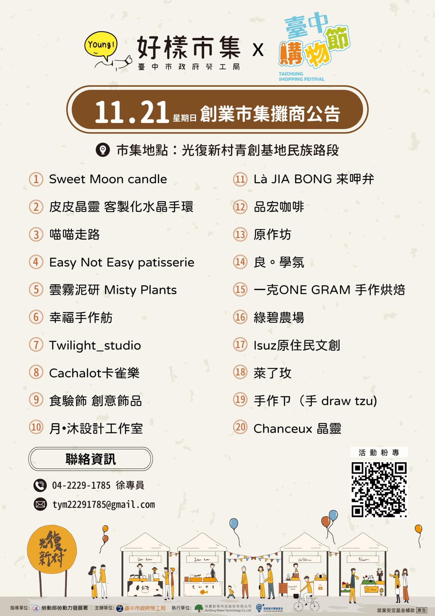 台中市政府勞工局與台中各大學合作舉辦的「Young!好樣市集」好評不斷,將於11月20、21日11至17時在光復新村青創基地,舉辦今年度最後的第19、20場,兩場市集皆有20組學生或創業青年團隊共同設攤,有手作甜點、創意商品等,邀請民眾把握*機會至現場選購屬意的特色商品。