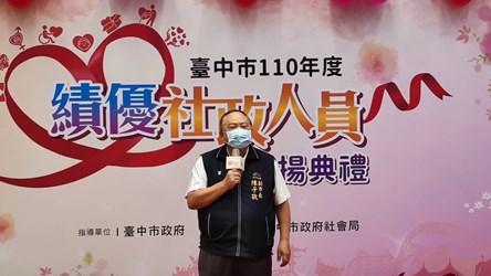 台中市政府社會局今(25)日舉行110年度績優社政人員表揚,副市長陳子敬代表市長盧秀燕到場頒獎致意,表揚134名績優社政人員,包含特殊貢獻獎1名、資深敬業服務獎39名、服務績優獎94名,感謝社政人員對台中市的付出與奉獻,從第一線到後端提供民眾各項服務,不畏疫情、堅守崗位,傳遞愛與關懷到社會各個角落,成為穩定社會的重要力量。