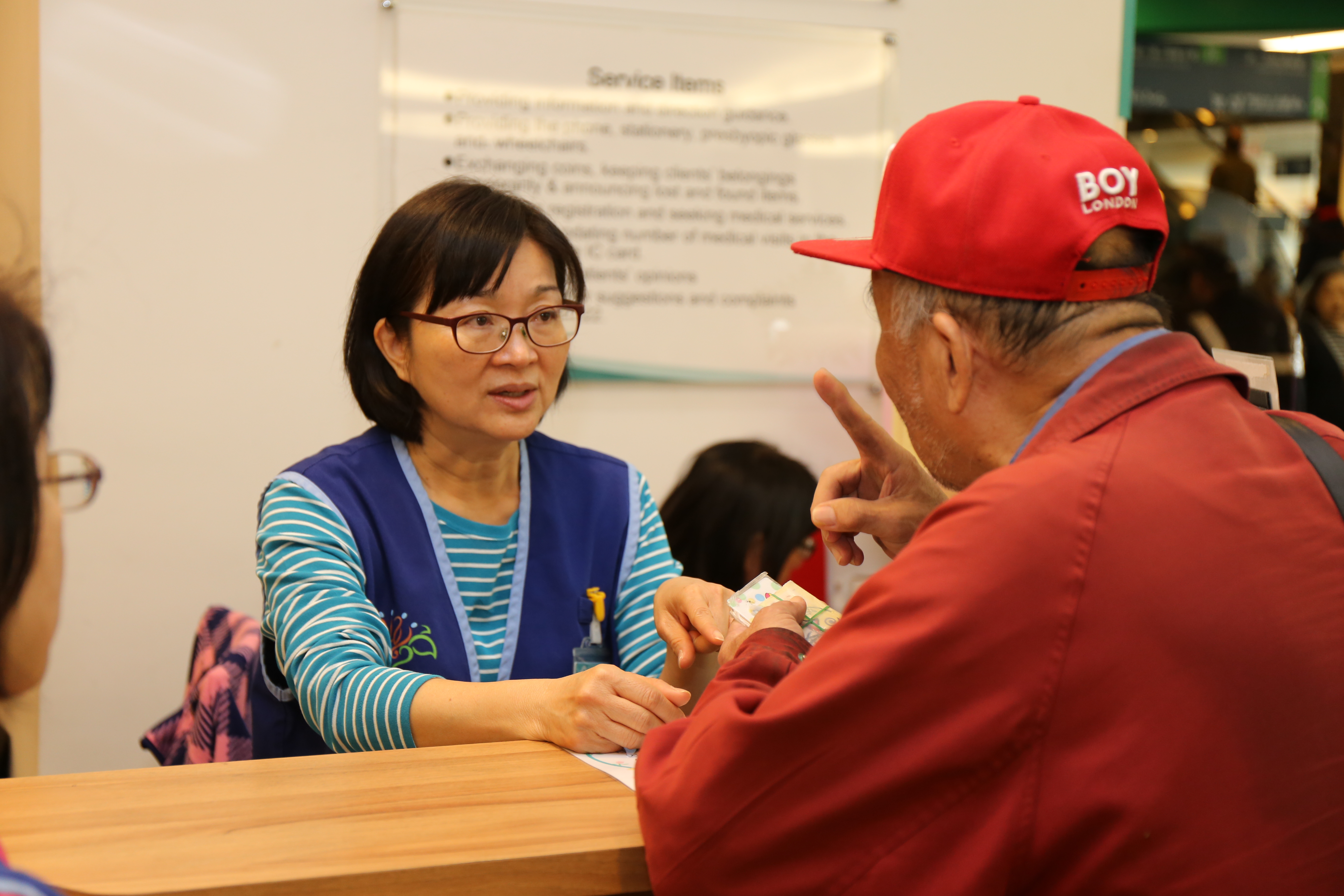 林淑華志工於服務櫃台耐心傾聽長者需求