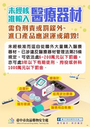 許多民眾搶搭防疫商機,私自從國外大量訂購醫療器材,恐觸犯醫療器材管理法。台中市食安處提醒,業者於製造、輸入醫療器材前,應依據醫療器材管理法,事先向中央衛生主管機關申請查驗登記核准,違者可依第68條處6萬至200萬元罰鍰,也可依違反第62條處3年以下有期徒刑、拘役或科以罰金,或併科1000萬元以下罰金,所輸入的醫療器材亦應依法限期退運或沒入銷毀。