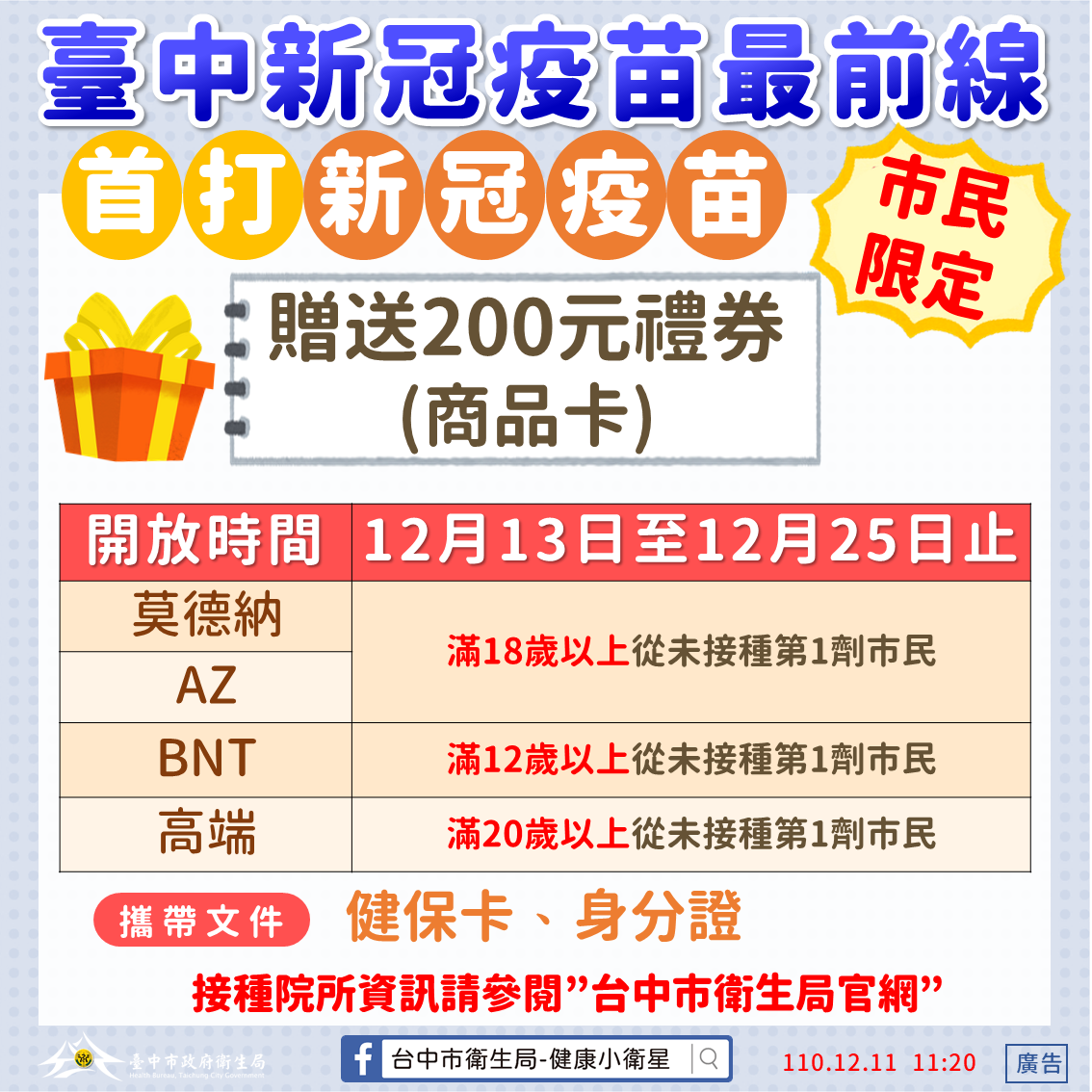 台中市政府昨(11)日啟動16處百貨、賣場等人潮聚集接種站,廣獲好評,為鼓勵尚未施打第一劑疫苗的市民踴躍接種,明日起至25日止推出首打族接種禮,設籍台中的市民至台中市指定地點,包含30區衛生所、合約醫院、診所、超商、賣場及百貨公司施打疫苗,即可現領200元7-11禮券,提醒市民施打時務必攜帶身分證及健保卡,以利身分認定核發禮券。