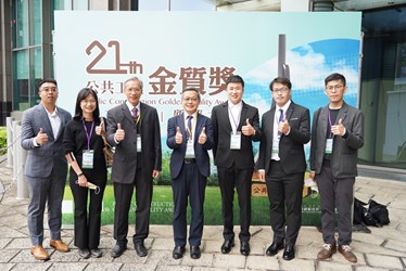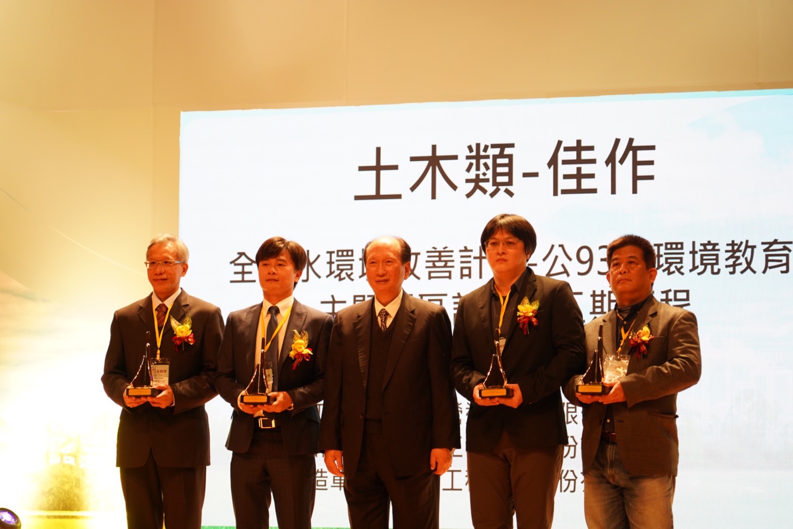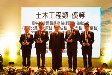 行政院公共工程委員會昨(23)日舉行第21屆公共工程金質獎頒獎典禮,台中市政府建設局以「台中都會區鐵路高架捷運化沿線5處(圓環北路、太原路、建成路、國光路、五權路)地下道填平工程-第二標(國光路、五權路)」及「全國水環境改善計畫-93水環境教育主題園區計畫第二期工程」榮獲優等獎及佳作殊榮佳績肯定,建設局長陳大田率領建設局主管及同仁北上受獎,感謝同仁及廠商辛勞外,更期盼將台中優良公共工程品質好口碑推向國際。