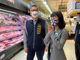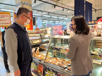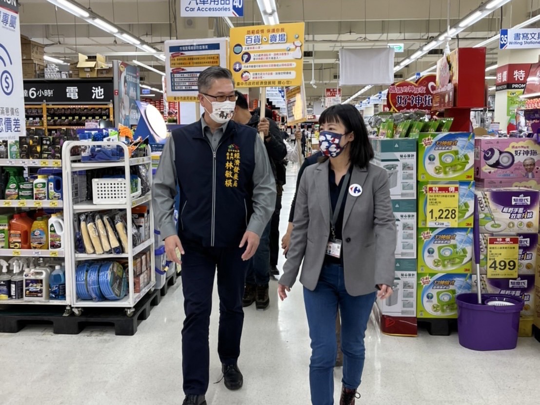 春節將至,百貨賣場等民生消費場域採買人潮湧現,因應國內近期出現本土群聚事件,台中市政府經濟發展局專門委員林敏棋昨(7)日率隊前往西屯區家樂福宣導,督導業者禁止試吃、邊走邊吃,並落實出入口專責人力負責實聯制、量測體溫、手部消毒等春節防疫專案措施。