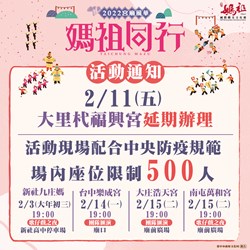 文化局表示,後續尚有大里杙福興宮、豐原慈濟宮、社口萬興宮、北屯南興宮、台中萬春宮、梧棲朝元宮及大肚萬興宮等宮廟將舉辦藝文匯演。為配合中央流行疫情指揮中心防疫規範,各場次活動皆設置出入口控管人流500人以內,座位安排室外保持1公尺社交距離,並請入場民眾配合實聯制、量測體溫、手部酒精消毒及全程佩戴口罩。有關活動詳情請上台中市政府文化局網站( https://www.culture.taichung.gov.tw/ )查詢。(2/9*15)*文化局