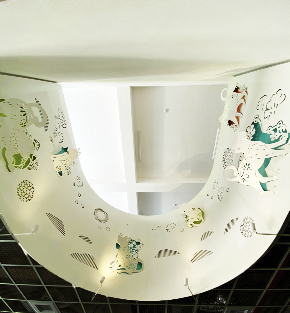 而台中市動物之家后里園區也新增了一組多件作品《守望:動物國探索》,將剪紙動物設置在園區的各個角落,圖像會隨著自然光影環繞在建物周遭,象徵著這些貓狗守護著動物之家,並時時刻刻陪伴著人類,入園訪客可以穿梭探險園區,感受與毛小孩不期而遇的驚喜。