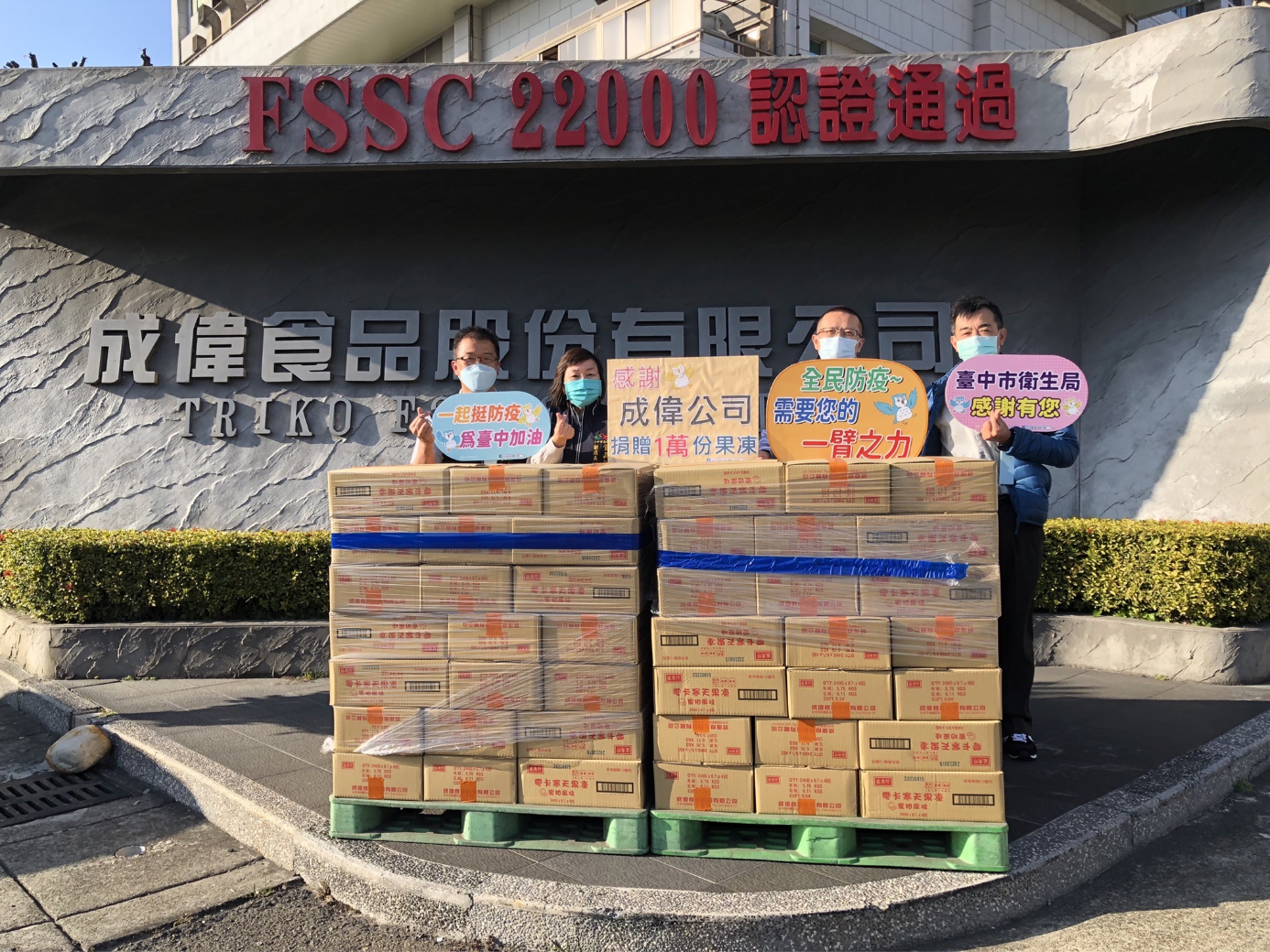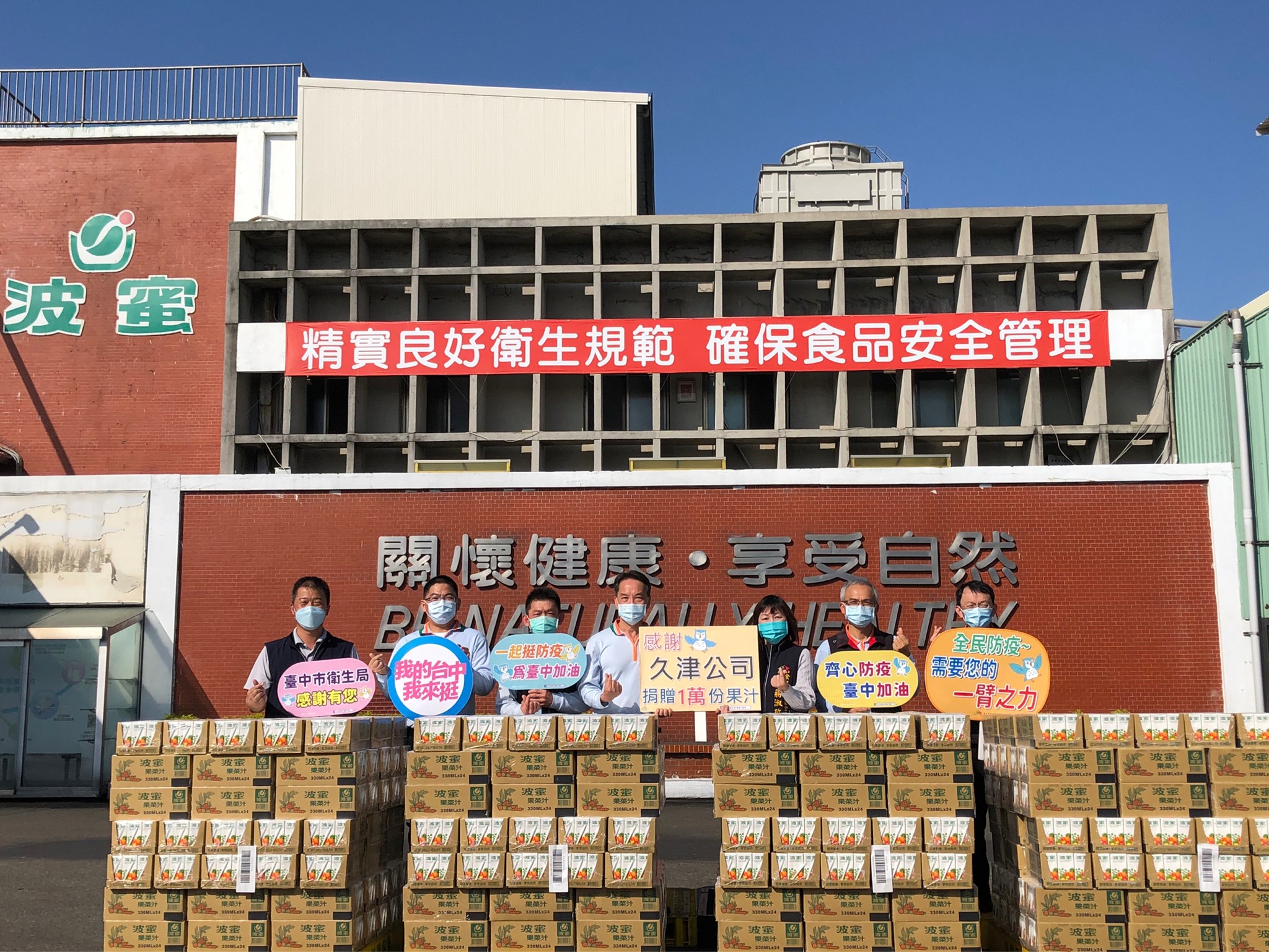 台中市第三劑新冠疫苗接種加碼禮出爐了!市府感謝久津實業公司捐贈波蜜果菜汁1萬瓶、成偉食品公司捐贈盛香珍果凍1萬份,共同響應力拚新冠疫苗第三劑接種行動。