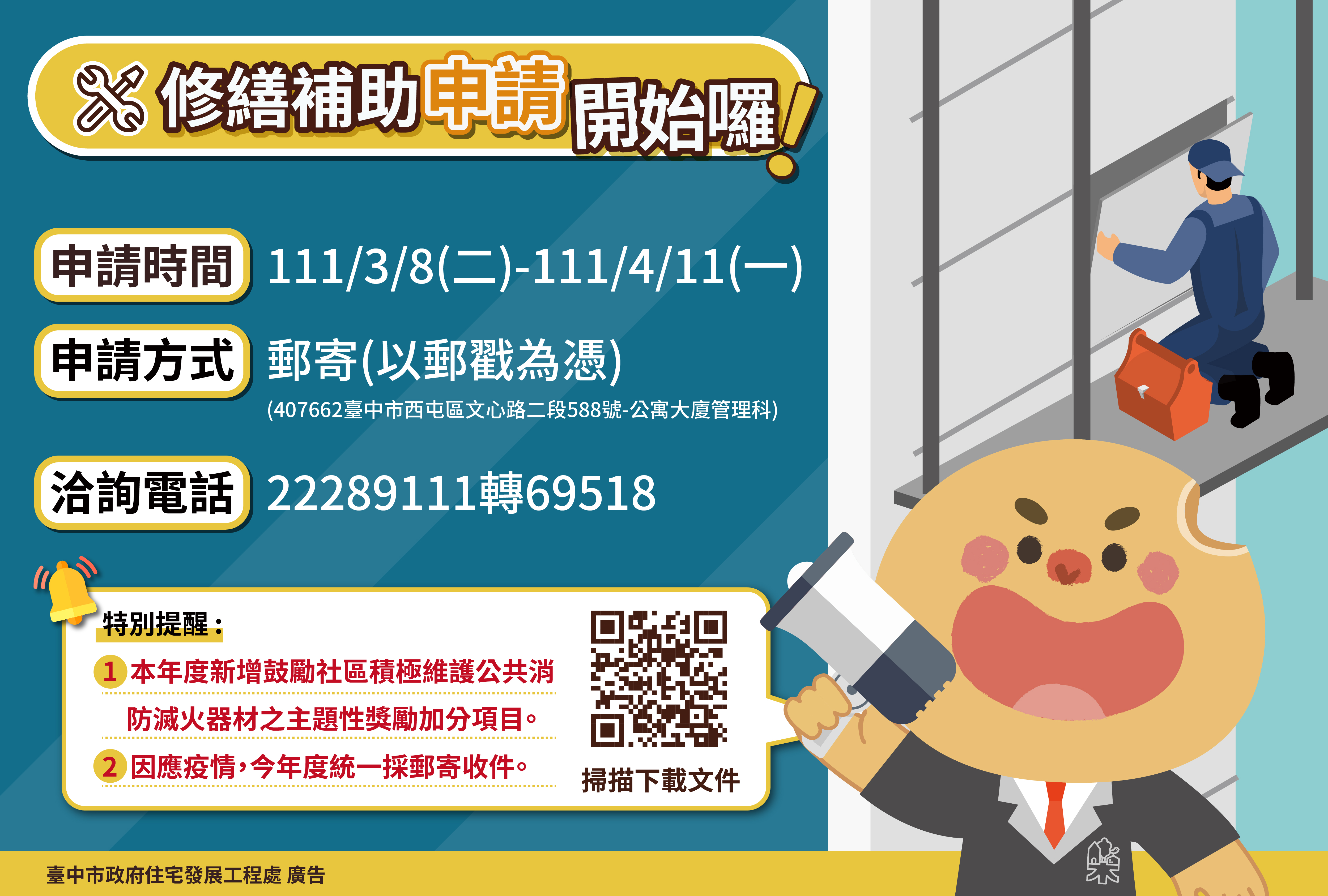 台中市一年一度的公寓大廈共用部分及約定共用部分維護修繕費用補助,自38日起受理至411日止,補助項目包含公共通道溝渠及簡易既有共用及相關設施修繕、公共消防滅火器材維護及環境清潔衛生維持,維護社區居住品質及公共安全,歡迎社區踴躍提出申請,此外,因受新冠肺炎疫情影響,社區公共環境消毒亦可申請補助,且今年度受理收件方式統一改採郵件遞送。