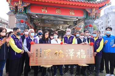 今(4)日是農曆二月初二土地公生日,也是傳統民俗節日「頭牙」,台中市龍井區東海圓圈彎福德祠舉辦祭典,慶讚福德正神聖誕。市長盧秀燕前往祈福參拜,同時頒贈「福澤佑民」匾額誌慶。她表示,感謝廟方長年對地方的貢獻,祈求神明繼續庇佑市民、市運昌隆,也期盼疫情早日退散,烏俄戰爭早日結束、烏克蘭人民平安。
