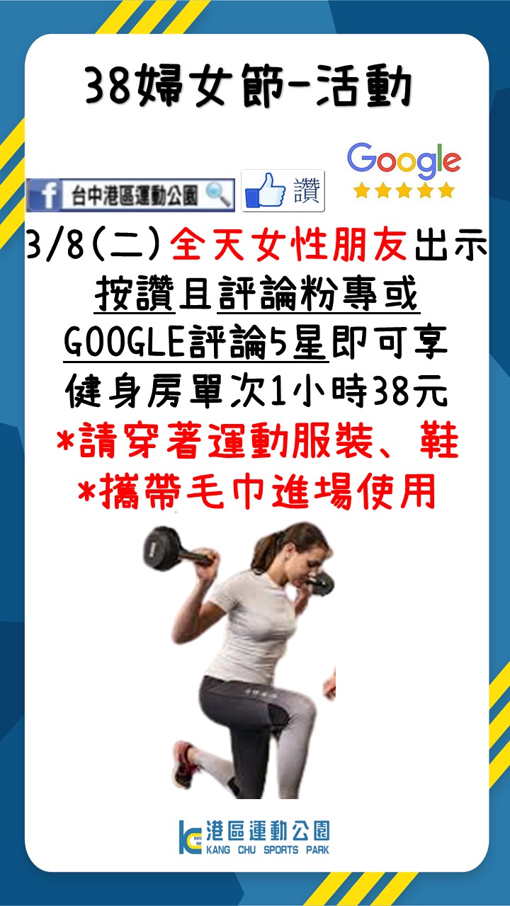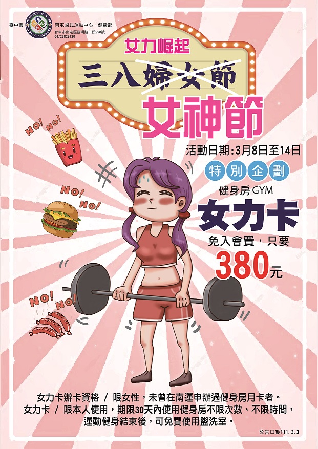 運動局說明,因應國內疫情各國運中心持續落實防作為,並針對女性族群提供優惠參加專案,如朝馬國民運動中心開設小班制游泳女性專班、北區國民運動中心祭出體適能一對一課程、南屯國民運動中心推出「女力崛起─三八女神節特別企劃」提供優惠方案、大里國民暨兒童運動中心規劃婦女節限定活動,另包含潭子、長春、港區運動公園等均推出多項課程與優惠。