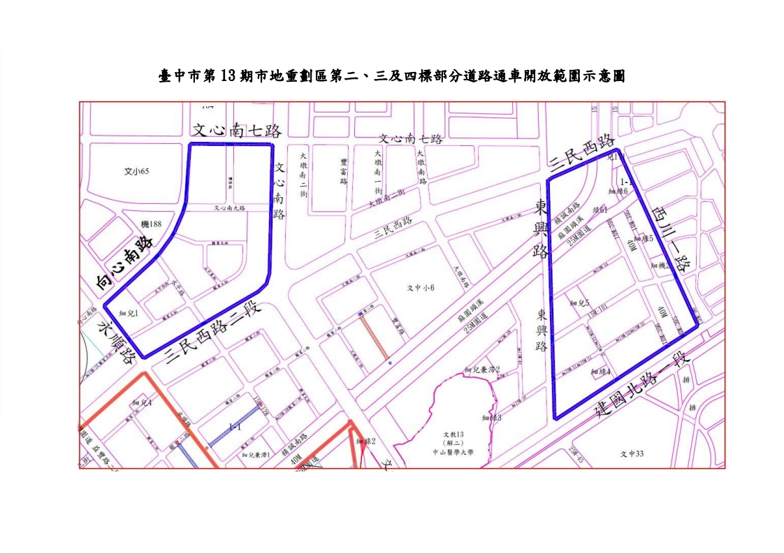 台中市第13期市地重劃區近期將完成重劃區交地作業,考量開放通車後可舒緩建國北路、文心南路及三民西路車流量,降低車潮壅塞程度,台中市政府表示,自今(14)日起開放第13期重劃區部分道路通行使用,包含南區東興路以東區域、南屯區文心南路西側與向心南路間區域等2處,但不含西川二路生態景觀渠道及細10M-54道路,盼供民行的便利。
