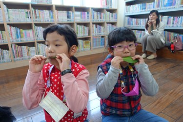 大安分館則運用圖書結合音樂遊戲,帶領親子共玩、共學,活動還結合大自然樂器DIY課程,利用不同植物的葉子做吹笛,大人小孩一同吹響大自然樂章。外埔分館4月2日也舉辦「哼哼就能玩音樂」,簡易自製並介紹卡祖笛,讓孩子哼唱猜歌曲;龍井龍津分館的「指尖上的寵愛─卡林巴琴」,則是以卡林巴琴演出,帶孩子認識異國樂器樂曲。