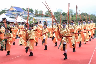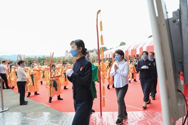 今日祭典中的三獻禮,由盧市長擔任初獻正獻官,亞獻正獻並由金陵山宗教園區總裁湯文萬擔任,終獻正獻則由寶光崇正道場樞紐翁嵩慶擔任,祭祀儀式由鼓初嚴、鼓再嚴、鼓三嚴提醒全場肅穆,典禮揭開序幕、迎神、獻供禮、祭拜白陽三聖、三獻禮,至撤饌、送神等儀程,歷時1個半小時禮成、撤班,展現慎終追遠的文化精神,體現豐富的人文美學與禮儀層次。