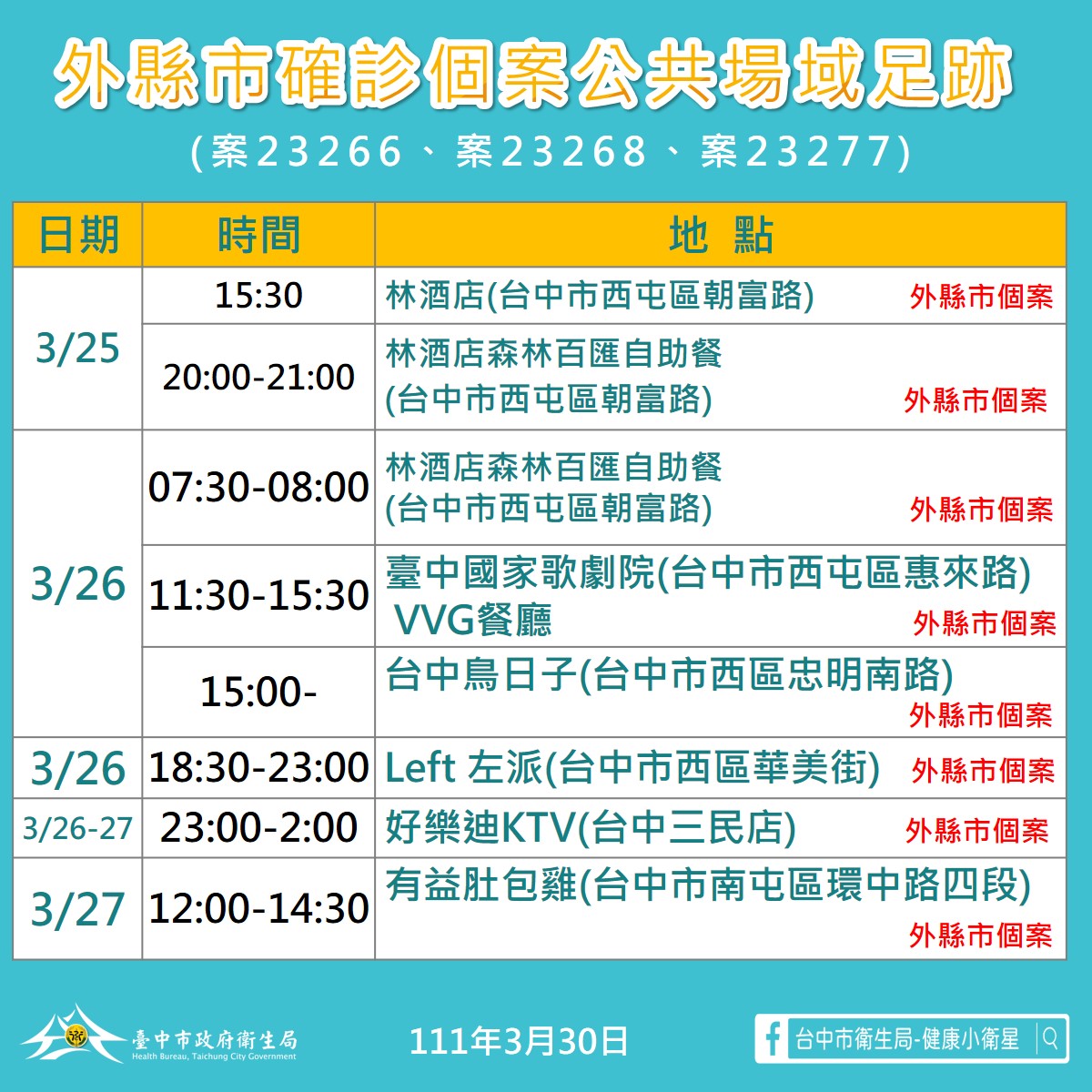 衛生局表示,接獲通知後立即展開疫調,3名個案於326日於台中市VVG餐廳參加婚宴,婚宴親友來自外縣市者將由當地衛生局追蹤安排PCR採檢。確診個案325日、26日及27日在台中市的足跡有林酒店森林百匯自助餐、left左派酒吧、台中鳥日子、好樂迪KTV台中三民店、有益肚包雞,衛生局持續疫調及執行接觸者匡列中。