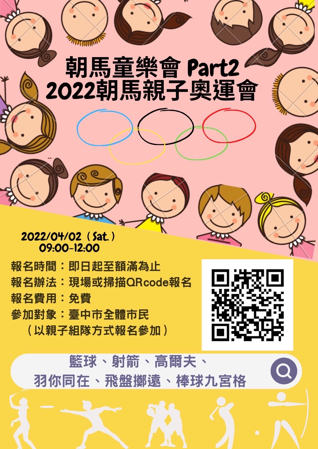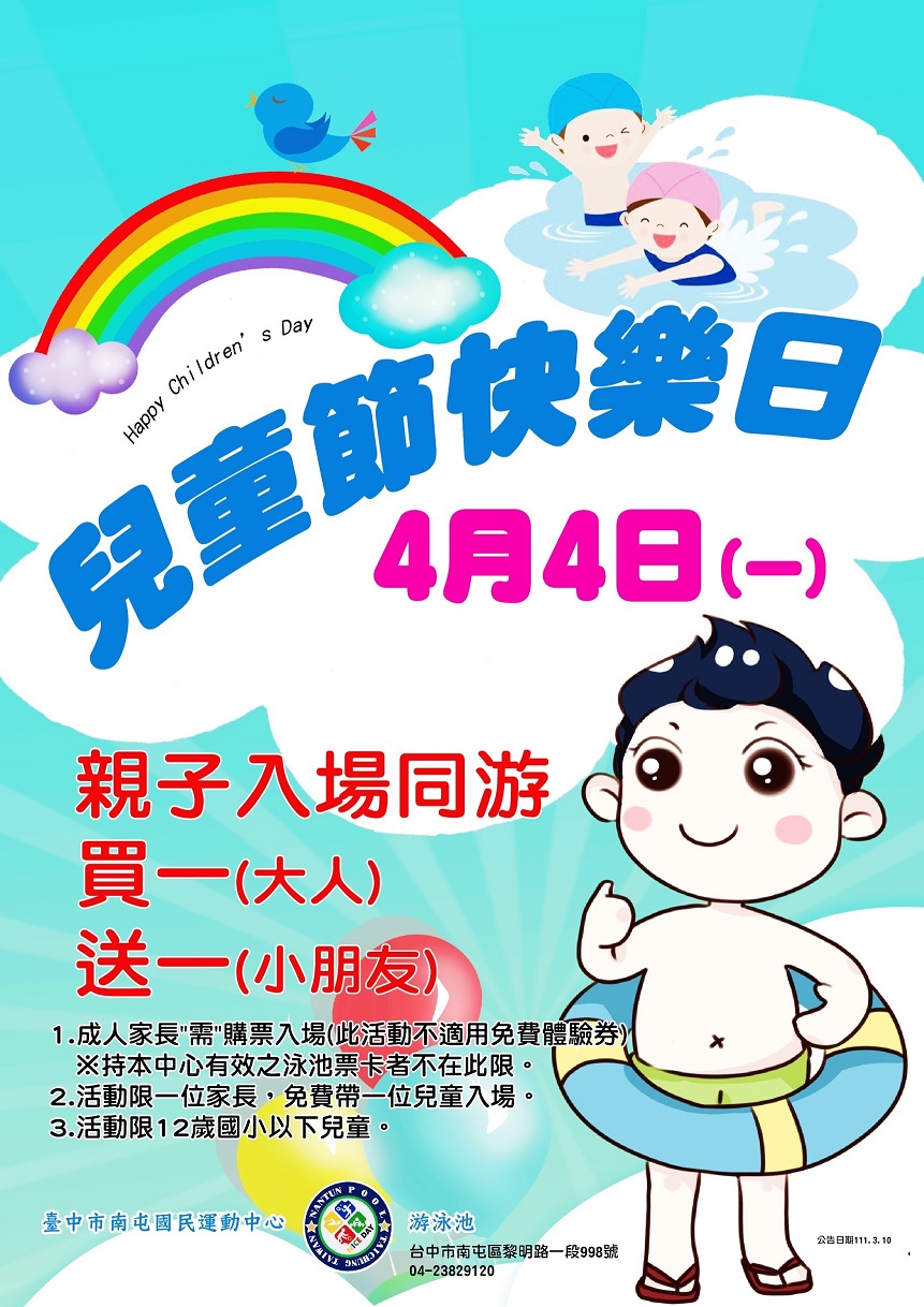運動局說明,因應國內疫情,各國運中心嚴格落實防疫作為,並響應兒童節連假,提供豐富的兒童與親子專屬運動課程,如朝馬國民運動中心明日將舉辦「朝馬親子奧運會」,邀請親子組隊報名參賽;南屯運動中心規劃44日當天為「兒童節快樂日」,每一位家長購票使用游泳池設施,即可同步免費帶一位12歲以下兒童入場使用。