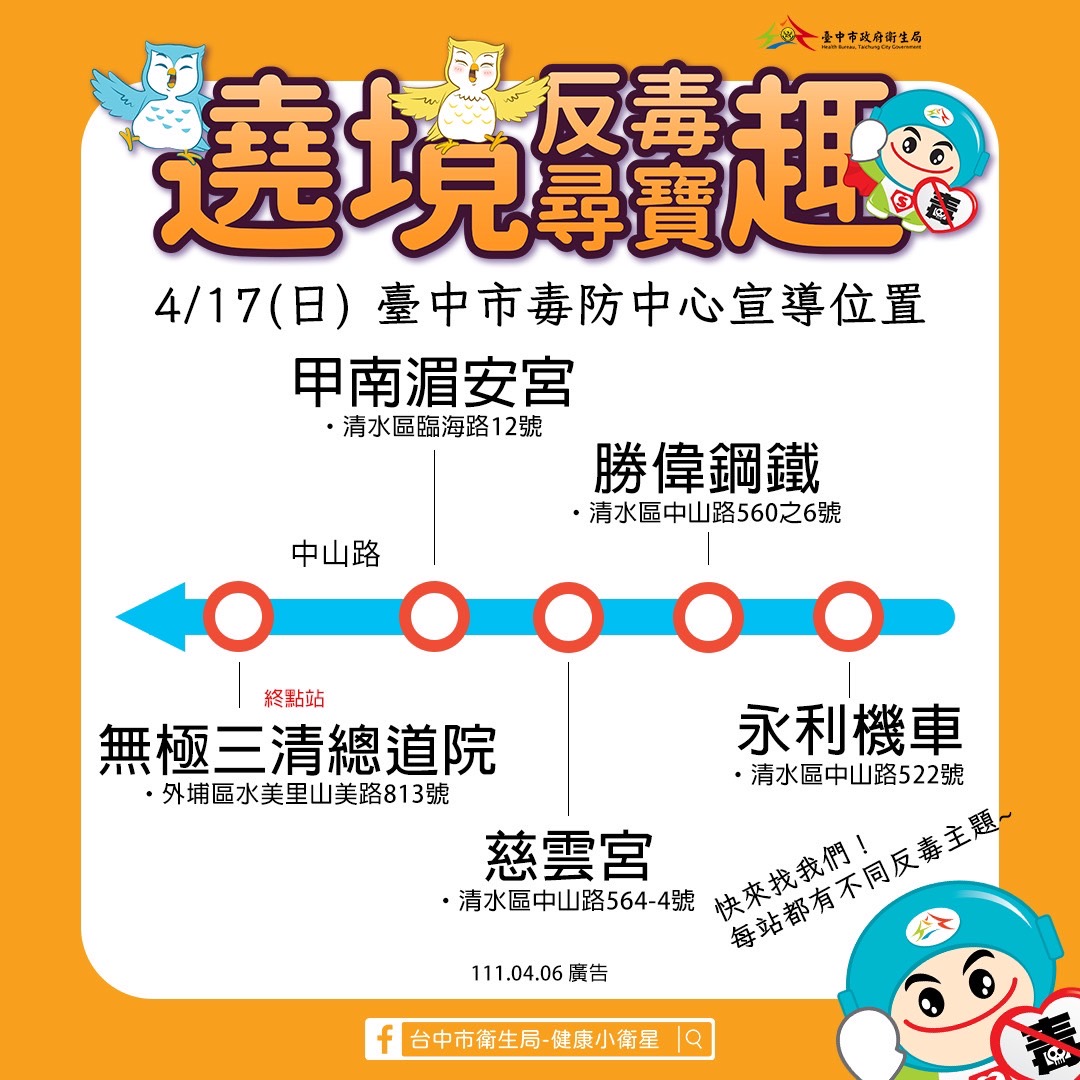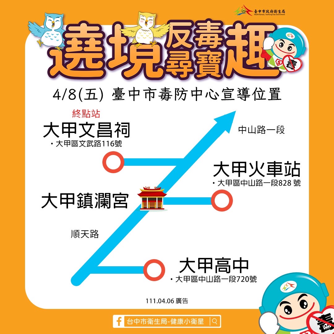 國內宗教大事大甲媽祖遶境將於後(8)天起駕,每年吸引百萬信徒參加,一起瘋媽祖,台中市政府衛生局後天於大甲鎮瀾宮周邊,4月16和17日於大肚區、沙鹿區及清水區沿途地點,設置「遶境反毒尋寶趣」,結合在地文化拉近民眾距離,提醒多一分警覺,少一分危險,拒絕毒品進入家園。