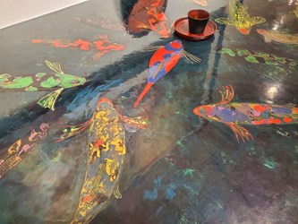 策展人楊美玲說明,此次展出70件賴作明代表作,包含樹漆畫、樹漆陶、繩胎漆器、脫胎漆器及木胎漆器等5大類型。其中於2009年完成的「木胎漆器」經典作品〈清清桌子〉長2米、寬1米,描繪20餘條色彩鮮豔的手繪錦鯉,悠游於波光粼粼的綠川,水面深淺不一的綠色光澤,充分表現出賴作明擅長的變塗技法。