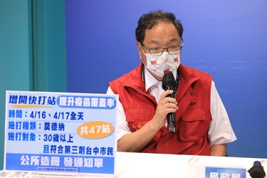 國內本土疫情持續升溫,確診數連日破百例,為提升城市防護力及個人保護力,市長盧秀燕今(10)日表示,台中市政府首次下修年齡,開放設籍台中市30歲以上符合施打第三劑市民,共約33萬名,可於4月16、17日兩日至全市47處快打站施打莫德納疫苗,市府將統一造冊、分流施打,各區公所將主動通知,民眾免預約、免排隊,請市民按通知時間、地點到快打站施打。