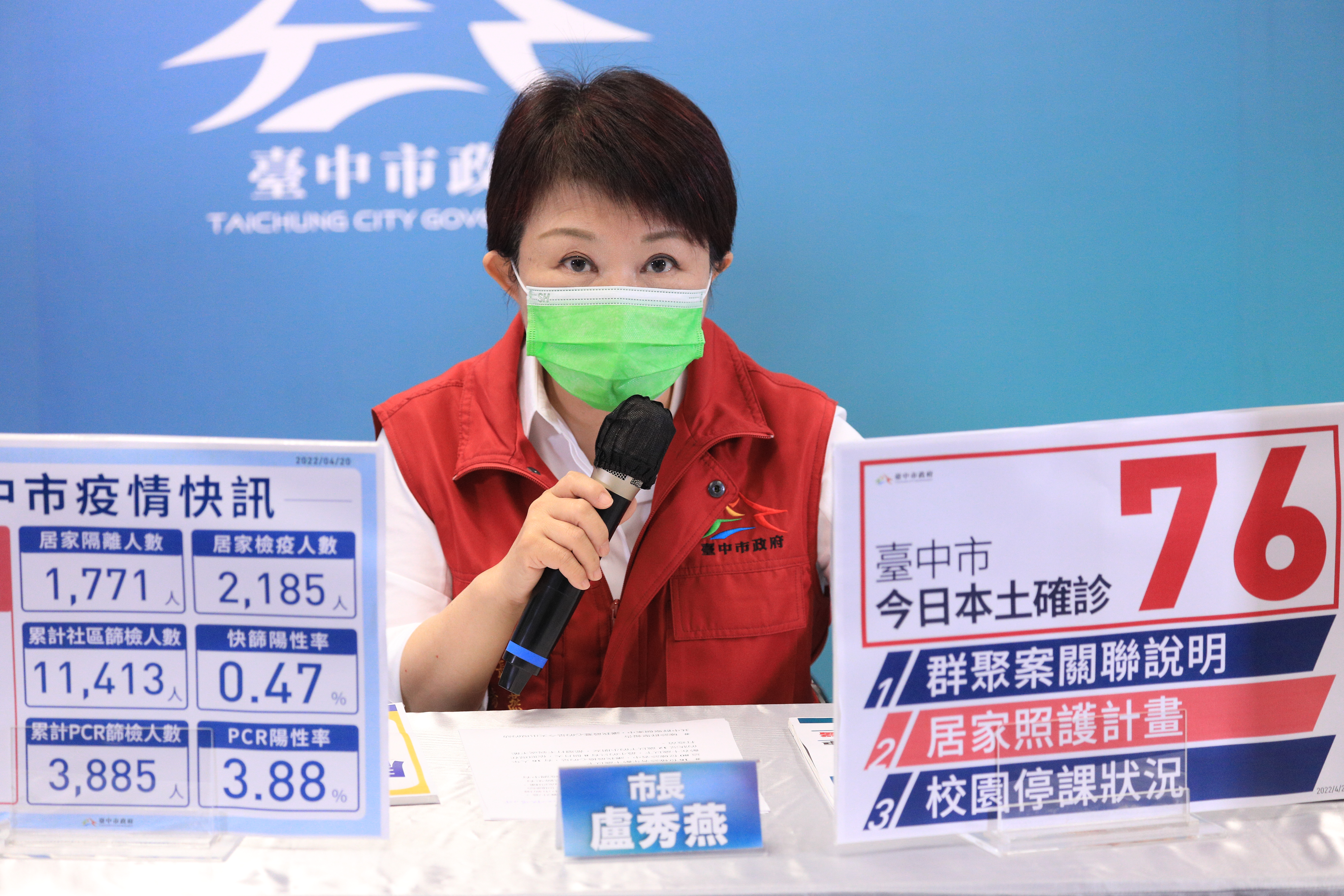 台中市今(20)日新增80例本土確診個案,原中央公布台中市新增76例,不過有4例原本是外縣市個案,中央判定回歸給台中市。市長盧秀燕今日召開防疫記者會表示,今日台中新增80例本土確診,依感染源樣態,分成已知群聚案32例、外縣市足跡史15例、密切接觸者3例、感染源調查中30例,足跡已全面通知清消並持續疫調,疫情仍在升溫,全國本土今新增2千多例,比昨日增加四成,提醒民眾落實防疫。