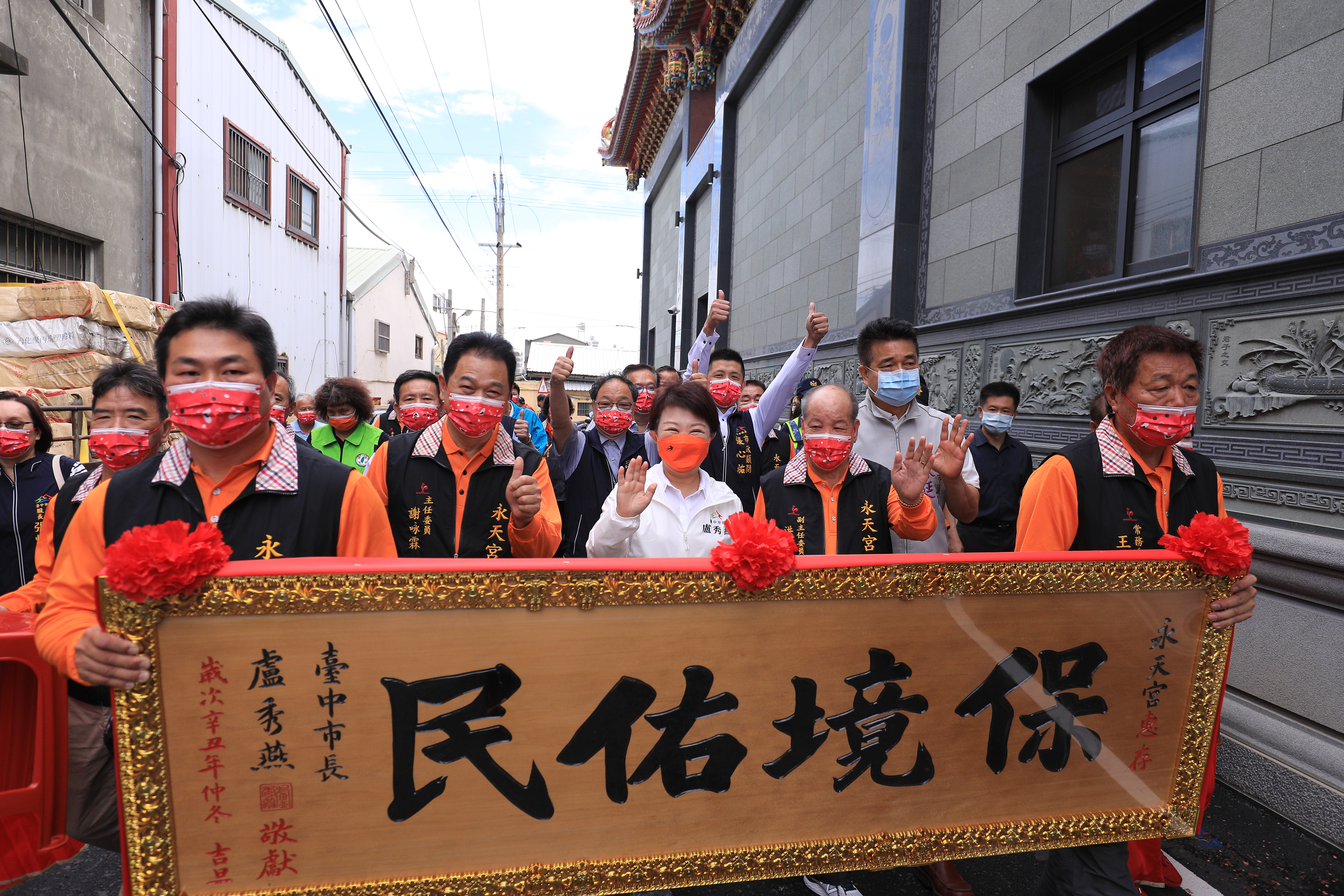 盧市長表示,永天宮主祀天上聖母,是當地重要的信仰中心,感謝主任委員謝咏霖帶領團隊為原年久失修的廟宇進行重建,今日特別頒贈「保境佑民」匾額,希望讓地方看見媽祖的慈悲及神威;近期疫情升溫,相信媽祖會保佑國泰民安,也提醒市民落實防疫別輕忽;另今日是媽祖的生日,祈佑媽祖保濟安明,祝福地方人民身心健康。