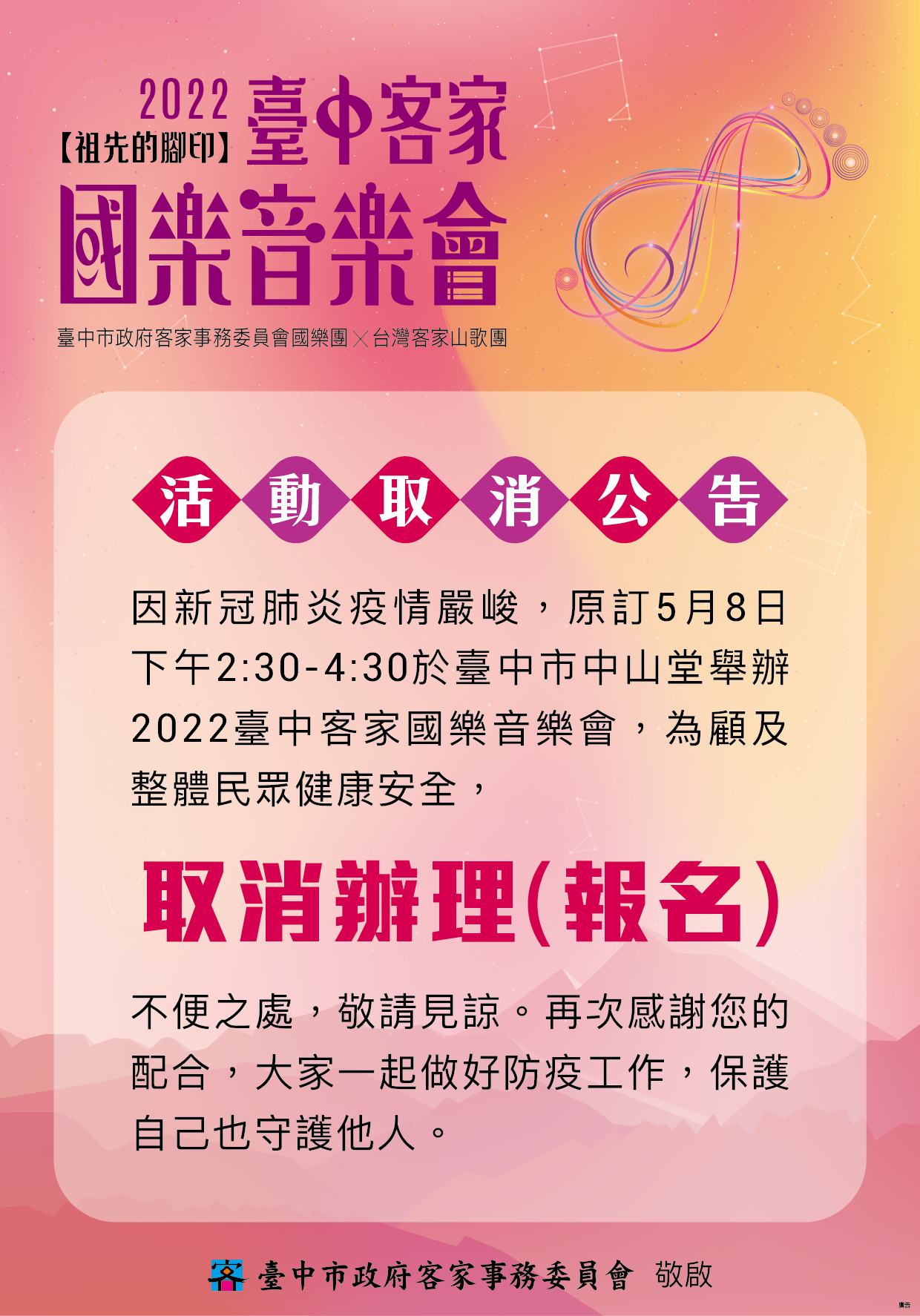 客委會指出,「2022台中客家國樂音樂會」籌備許久,原訂在5月8日母親節當天舉辦音樂會,指揮蔡玟玲老師率領團員練習多時,並邀請台灣客家山歌團共同合作演出,由團長姜雲玉率領呂錦明、黃珮舒、黃世欣、陳石貴及陳欣豪等優秀團員帶來國樂版「祖先的腳印」的首場演出。但因演出場地中山堂座位高達1,500人,考量室內活動恐有群聚感染風險,為確保市民朋友的健康安全,經綜合評估後決定停止辦理。