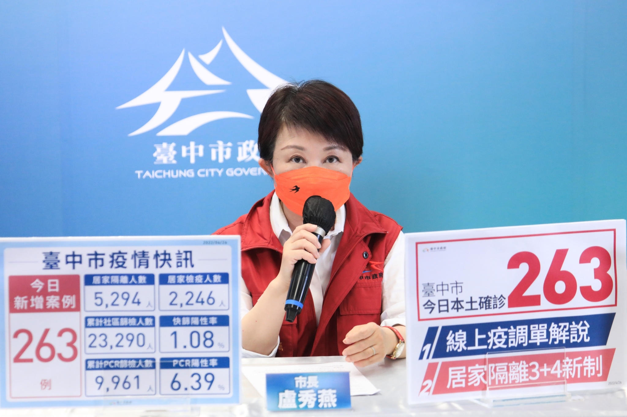 全國今(26)日本土確診新增6,295例,台中市本土個案新增263例,依年齡區分,未滿12歲27例,12至64歲224例,65歲以上12例;依性別來分,131位男性、132位女性;依感染源分類,密切接觸者98例,調查中165例。市長盧秀燕今日於防疫記者會表示,台中市即日起實施線上疫調回報機制,分為「確診個案疫調單」與「接觸者簡易疫調單」兩種,希望個案都能落實「為愛匡列」,保護你我健康。