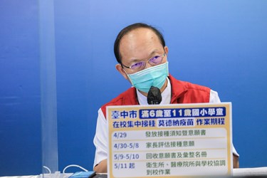 盧市長也說,教育部國教署昨晚邀集各縣市教育局開會,討論6至11歲學童疫苗接種注意事項,台中市教育局也同步進行內部作業,按目前準備作業,台中市境內國小預計4月29日這周五發放「接種須知暨接種意願書」,讓學童帶回家給家長評估是否同意子女接種疫苗,各校預計5月初回收意願書,確認接種作業完成後,預計在5月11日起於校內讓6至11歲學童接種疫苗,但仍要視中央撥發疫苗的確定時間來調整施打計畫。