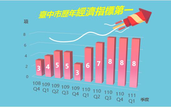 張局長表示,經濟指標最能忠實反映城市發展狀況,現今各都市競爭激烈,2項指標奪冠已屬難得,台中面對疫情考驗,108年第四季3項指標居冠,到現在8項指標連三季居冠。除歸功於台中良好的投資環境外,產業屬性以出口導向為主也是一大主因,財政部近期宣布台灣出口連21紅,台中尤其以自行車零組件、金屬及其製品國際買氣旺盛。